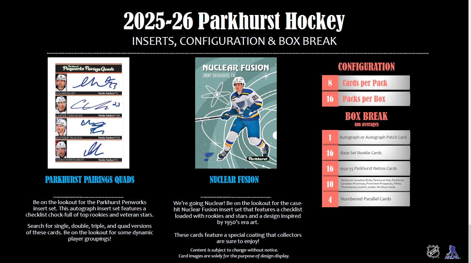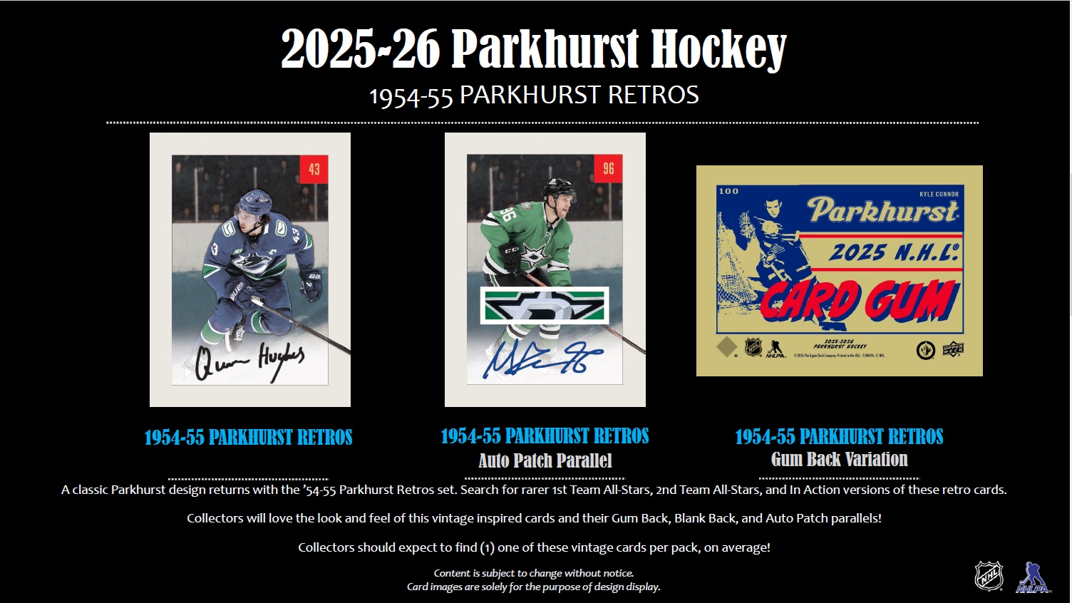 One of the most unique releases of the year, Parkhurst, returns for the 2025-26 Season. This edition of the product is chock-full of talented rookies and star veterans on a vintage inspired design. Collectors should expect to find one (1) Autograph card per box, on average. o The Base Set for this product breaks down as follows: Base Set (1-200) and Base Set Rookies SPs (201-250) o Be on the lookout for a wide variety of parallels of the Base Set highlighted by the Gum Back, Est. 1951 - Emerald Ice (#’d to 51), 1954-55 Wrapper Backs (#’d to 15), and Est. 1951 Gold Spectrum (#’d 1-of-1) parallels. ? Search for low-numbered Rookie Auto Patch cards! ? Collectors should expect to find one (1) Base Set - Rookie Card per pack, on average! • All-New Inserts! o Celebrate the unique side of Parkhurst with classic 1950’s inspired Canadiana themed inserts such as Parkhurst Canadian Birds, Parkhurst Fish, and Parkhurst Canadian Provinces! Set collectors will love these inserts! Each card has vintage feeling artwork and a hearty nod to the 1950’s Parkhurst non-sports sets. o Be on the lookout for the Parkhurst Penworks insert set. This autograph insert set features a checklist chock-full of top rookies and veteran stars. Search for single, double, triple, and quad versions of these cards. Be on the lookout for some dynamic player groupings! o We’re going Nuclear! Be on the lookout for the Nuclear Fusion insert set that features a checklist loaded with rookies and stars and a design inspired by 1950’s era art. These cards feature a special coating that collectors are sure to enjoy! • A classic Parkhurst design returns with the ’54-55 Parkhurst Retros set. Search for rarer 1st Team All-Stars, 2nd Team All-Stars, and In Action versions of these retro cards. o Collectors will love the look and feel of this vintage inspired cards and their Gum Back, Blank Back, and Auto Patch parallels! o Collectors should expect to find (1) one of these vintage cards per pack, on average!