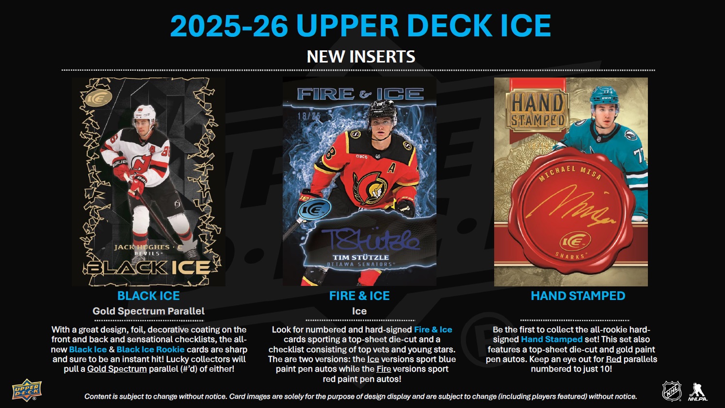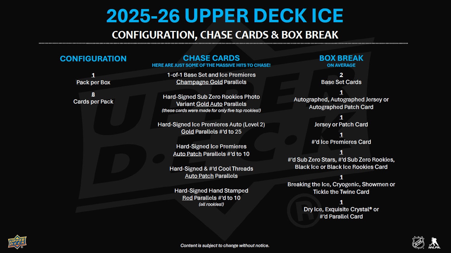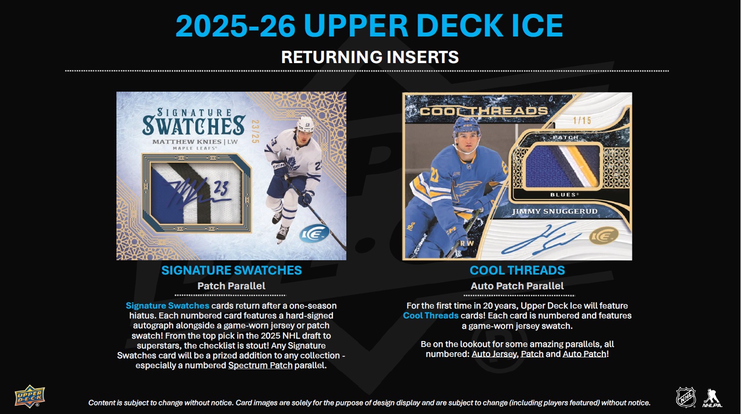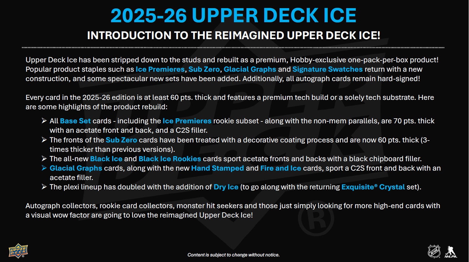 INTRODUCTION TO THE REIMAGINED UPPER DECK ICE! Upper Deck Ice has been stripped down to the studs and rebuilt as a premium, Hobby-exclusive one-pack-per-box product! Popular product staples such as Ice Premieres, Sub Zero, Glacial Graphs and Signature Swatches return with a new construction, and some spectacular new sets have been added. Additionally, all autograph cards remain hard-signed! Every card in the 2025-26 edition is at least 60 pts. thick and features a premium tech build or a solely tech substrate. Here are some highlights of the product rebuild: • All Base Set cards - including the Ice Premieres rookie subset - along with the non-mem parallels, are 70 pts. thick with an acetate front and back, and a C2S filler. • The fronts of the Sub Zero cards have been treated with a decorative coating process and are now 60 pts. thick (3-times thicker than previous versions). • The all-new Black Ice and Black Ice Rookies cards sport acetate fronts and backs with a black chipboard filler. • Glacial Graphs cards, along with the new Hand Stamped and Fire and Ice cards, sport a C2S front and back with an acetate filler. • The plexi lineup has doubled with the addition of Dry Ice (to go along with the returning Exquisite® Crystal set). Autograph collectors, rookie card collectors, monster hit seekers and those just simply looking for more high-end cards with a visual wow factor are going to love the reimagined Upper Deck Ice! BASE SET The 200-card Base Set consists of 100 top veteran cards (at least two players from all 32 teams) and 100 Ice Premieres rookie cards broken into four numbered tiers: 999, 499, 249 or 99. The parallel lineups for both the Base Set and Ice Premieres subset are headlined by the new 1-of-1 Champagne Gold cards. They will be massive chase cards! Also keep an eye out for, among others, Gold (#’d to 25), Patch (#’d to 35; game-worn), Red Auto, Gold (#’d to 25) and Gold Auto (#’d to 10) parallels of the Base Set, and Gold (#’d to 25) parallels of the Ice Premieres subset. • Each box will contain, on average, two (2) Base Set cards and one (1) Ice Premieres card numbered to either 999 or 499. INSERT SETS - RETURNING The Ice Premieres offering doesn’t end with the Base Set! The latest edition of Upper Deck Ice sports an abundance of Ice Premieres auto, mem and auto-mem sets featuring just top rookies from the 2025-26 class. Look for the following: • Ice Premieres Auto cards numbered to 299 or 199, as well as Gold parallels numbered to 25. • Ice Premieres Jersey cards falling one in every three boxes, on average, along with Auto Jersey (#’d to 35), Patch (#’d to 25) and Auto Patch (#’d to 10) parallel chase cards! The stunning Glacial Graphs set is back! Autographed by top veterans and young stars, these cards will be a hit with any type of collector. Keep an eye out for Black parallels (#’d as low as 5) that sport silver ink autos. Some will also boast an inscription! The Sub Zero Stars (#’d to 399), Sub Zero Rookies (#’d to 499) and Sub Zero Rookies Photo Variant (#’d to 49) sets are back as well. The checklists for both rookie sets focus on the top names in the rookie class - especially the Rookie Photo Variants where cards were made for just five top rookies! Keep an eye out for Blue Auto, Gold (#’d to 24) and Gold Auto (#’d to 10) parallels of the Rookies, Gold (#’d to 8) parallels of the Stars, and Gold Auto (#’d to 10) parallels of the Rookie Photo Variants! Signature Swatches cards return after a one-season hiatus. Each numbered card features a hard-signed autograph alongside a game-worn jersey or patch swatch! From the top pick in the 2025 NHL draft to active superstars, the checklist is stout! Any Signature Swatches card will be a prized addition to any collection - especially a numbered Spectrum Patch parallel. Look for Exquisite® Crystal plexi cards! With a limited print run, a beautiful design and a checklist loaded with top rookies, top second- and third-year players and active superstars, these cards are surefire hits! For the first time in 20 years, UD Ice will feature Cool Threads cards! Each card is numbered to 249 and features a game-worn jersey swatch. Be on the lookout for some amazing parallels (all #’d): Auto Jersey, Patch and Auto Patch! INSERT SETS - NEW With a great design, foil, decorative coating on the front and back and sensational checklists, the all-new Black Ice & Black Ice Rookie cards are sharp and sure to be an instant hit! Lucky collectors will pull a Gold Spectrum parallel (#’d to 25) of either! While more common than most of the cards in the product, collectors will still be delighted by the Breaking the Ice (top rookies and young superstars), Cryogenic (superstars and top rookies), Showmen (superstars and top rookies) and Tickle the Twine (top goalscorers) sets. All four look amazing and the Breaking the Ice, Cryogenic and Tickle the Twine designs are accentuated with deco linework. Each box will contain, on average, one (1) of these cards. Look for numbered and hard-signed Fire & Ice cards sporting a top-sheet die-cut and a checklist consisting of top veterans and young stars. The are two versions: the Ice versions sport blue paint pen autos while the Fire versions sport red paint pen autos! Be the first to collect the all-rookie hard-signed Hand Stamped set! This set also features a top-sheet die-cut and gold paint pen autos. Keep an eye out for Red parallels numbered to just 10! More plexi cards! Collect the all-new Dry Ice “frosted” plexi set featuring active veterans and top rookies!