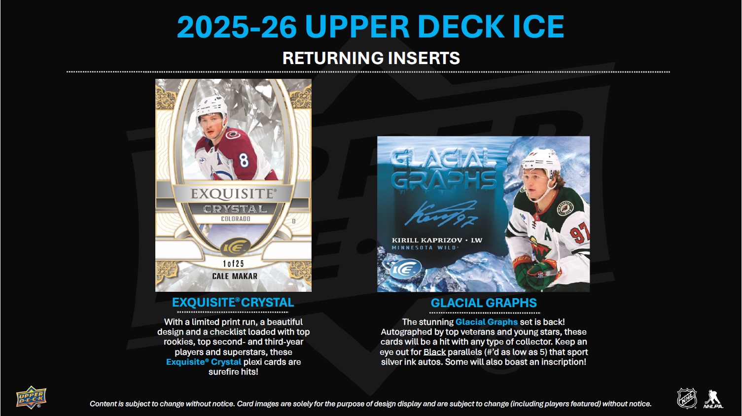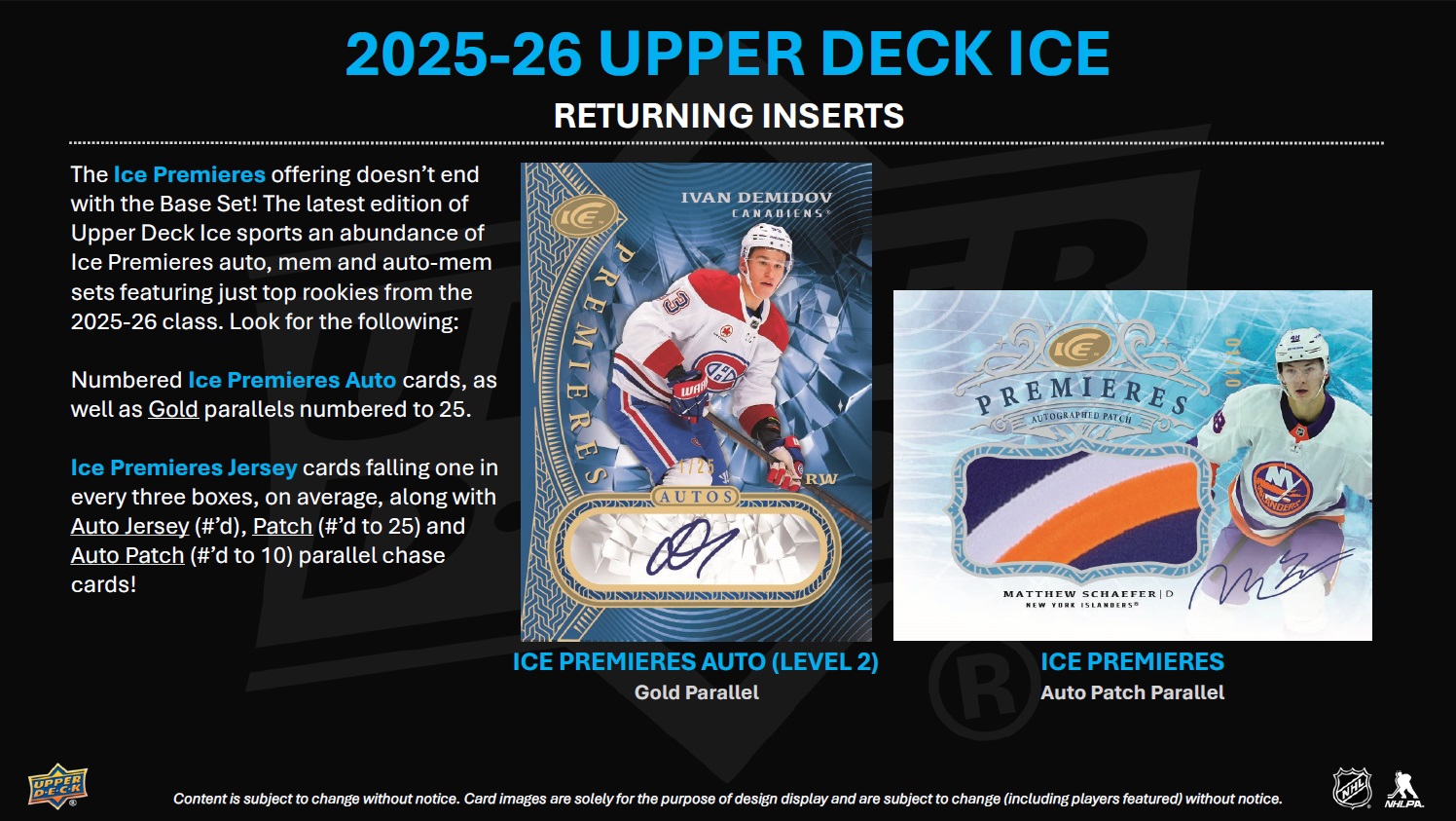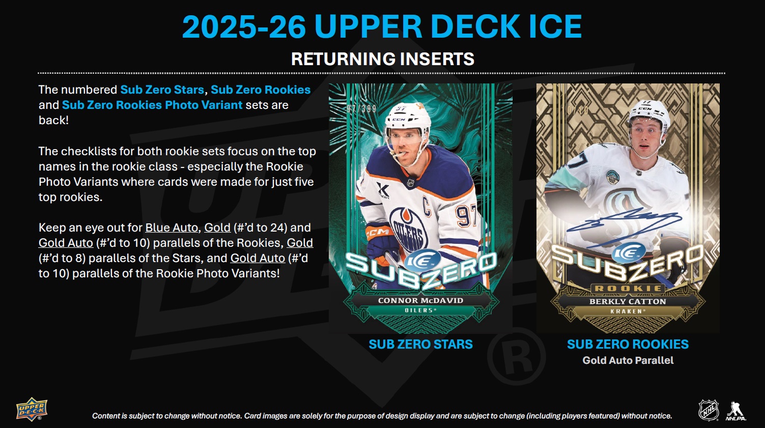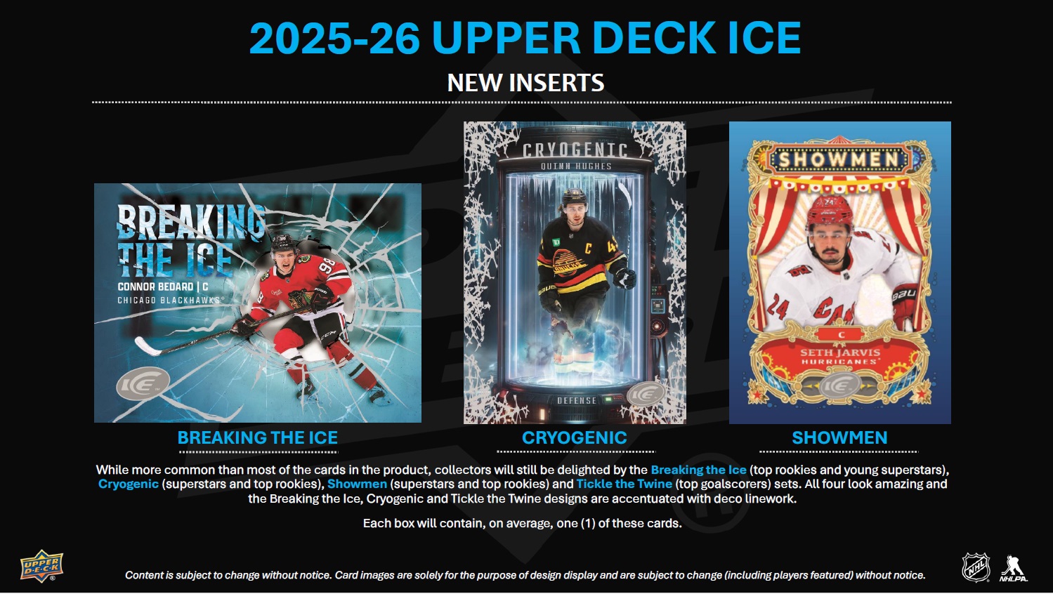 INTRODUCTION TO THE REIMAGINED UPPER DECK ICE! Upper Deck Ice has been stripped down to the studs and rebuilt as a premium, Hobby-exclusive one-pack-per-box product! Popular product staples such as Ice Premieres, Sub Zero, Glacial Graphs and Signature Swatches return with a new construction, and some spectacular new sets have been added. Additionally, all autograph cards remain hard-signed! Every card in the 2025-26 edition is at least 60 pts. thick and features a premium tech build or a solely tech substrate. Here are some highlights of the product rebuild: • All Base Set cards - including the Ice Premieres rookie subset - along with the non-mem parallels, are 70 pts. thick with an acetate front and back, and a C2S filler. • The fronts of the Sub Zero cards have been treated with a decorative coating process and are now 60 pts. thick (3-times thicker than previous versions). • The all-new Black Ice and Black Ice Rookies cards sport acetate fronts and backs with a black chipboard filler. • Glacial Graphs cards, along with the new Hand Stamped and Fire and Ice cards, sport a C2S front and back with an acetate filler. • The plexi lineup has doubled with the addition of Dry Ice (to go along with the returning Exquisite® Crystal set). Autograph collectors, rookie card collectors, monster hit seekers and those just simply looking for more high-end cards with a visual wow factor are going to love the reimagined Upper Deck Ice! BASE SET The 200-card Base Set consists of 100 top veteran cards (at least two players from all 32 teams) and 100 Ice Premieres rookie cards broken into four numbered tiers: 999, 499, 249 or 99. The parallel lineups for both the Base Set and Ice Premieres subset are headlined by the new 1-of-1 Champagne Gold cards. They will be massive chase cards! Also keep an eye out for, among others, Gold (#’d to 25), Patch (#’d to 35; game-worn), Red Auto, Gold (#’d to 25) and Gold Auto (#’d to 10) parallels of the Base Set, and Gold (#’d to 25) parallels of the Ice Premieres subset. • Each box will contain, on average, two (2) Base Set cards and one (1) Ice Premieres card numbered to either 999 or 499. INSERT SETS - RETURNING The Ice Premieres offering doesn’t end with the Base Set! The latest edition of Upper Deck Ice sports an abundance of Ice Premieres auto, mem and auto-mem sets featuring just top rookies from the 2025-26 class. Look for the following: • Ice Premieres Auto cards numbered to 299 or 199, as well as Gold parallels numbered to 25. • Ice Premieres Jersey cards falling one in every three boxes, on average, along with Auto Jersey (#’d to 35), Patch (#’d to 25) and Auto Patch (#’d to 10) parallel chase cards! The stunning Glacial Graphs set is back! Autographed by top veterans and young stars, these cards will be a hit with any type of collector. Keep an eye out for Black parallels (#’d as low as 5) that sport silver ink autos. Some will also boast an inscription! The Sub Zero Stars (#’d to 399), Sub Zero Rookies (#’d to 499) and Sub Zero Rookies Photo Variant (#’d to 49) sets are back as well. The checklists for both rookie sets focus on the top names in the rookie class - especially the Rookie Photo Variants where cards were made for just five top rookies! Keep an eye out for Blue Auto, Gold (#’d to 24) and Gold Auto (#’d to 10) parallels of the Rookies, Gold (#’d to 8) parallels of the Stars, and Gold Auto (#’d to 10) parallels of the Rookie Photo Variants! Signature Swatches cards return after a one-season hiatus. Each numbered card features a hard-signed autograph alongside a game-worn jersey or patch swatch! From the top pick in the 2025 NHL draft to active superstars, the checklist is stout! Any Signature Swatches card will be a prized addition to any collection - especially a numbered Spectrum Patch parallel. Look for Exquisite® Crystal plexi cards! With a limited print run, a beautiful design and a checklist loaded with top rookies, top second- and third-year players and active superstars, these cards are surefire hits! For the first time in 20 years, UD Ice will feature Cool Threads cards! Each card is numbered to 249 and features a game-worn jersey swatch. Be on the lookout for some amazing parallels (all #’d): Auto Jersey, Patch and Auto Patch! INSERT SETS - NEW With a great design, foil, decorative coating on the front and back and sensational checklists, the all-new Black Ice & Black Ice Rookie cards are sharp and sure to be an instant hit! Lucky collectors will pull a Gold Spectrum parallel (#’d to 25) of either! While more common than most of the cards in the product, collectors will still be delighted by the Breaking the Ice (top rookies and young superstars), Cryogenic (superstars and top rookies), Showmen (superstars and top rookies) and Tickle the Twine (top goalscorers) sets. All four look amazing and the Breaking the Ice, Cryogenic and Tickle the Twine designs are accentuated with deco linework. Each box will contain, on average, one (1) of these cards. Look for numbered and hard-signed Fire & Ice cards sporting a top-sheet die-cut and a checklist consisting of top veterans and young stars. The are two versions: the Ice versions sport blue paint pen autos while the Fire versions sport red paint pen autos! Be the first to collect the all-rookie hard-signed Hand Stamped set! This set also features a top-sheet die-cut and gold paint pen autos. Keep an eye out for Red parallels numbered to just 10! More plexi cards! Collect the all-new Dry Ice “frosted” plexi set featuring active veterans and top rookies!