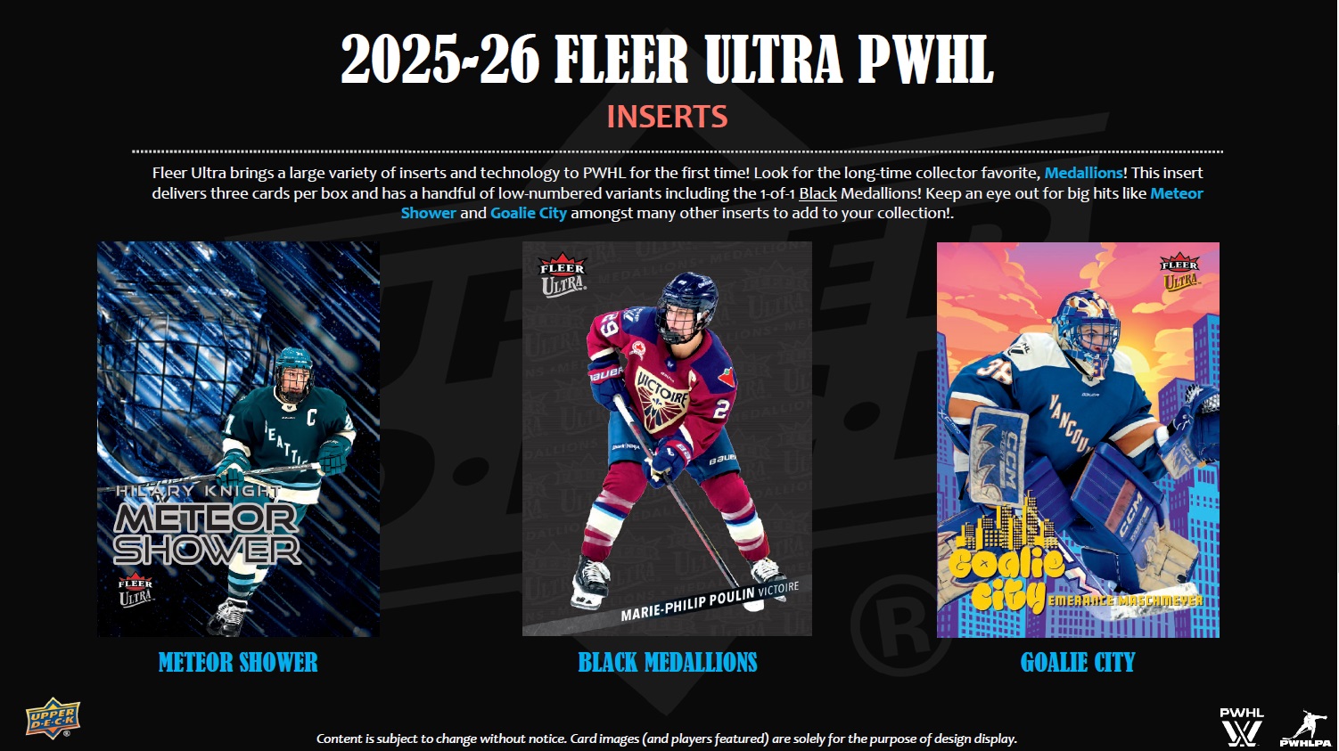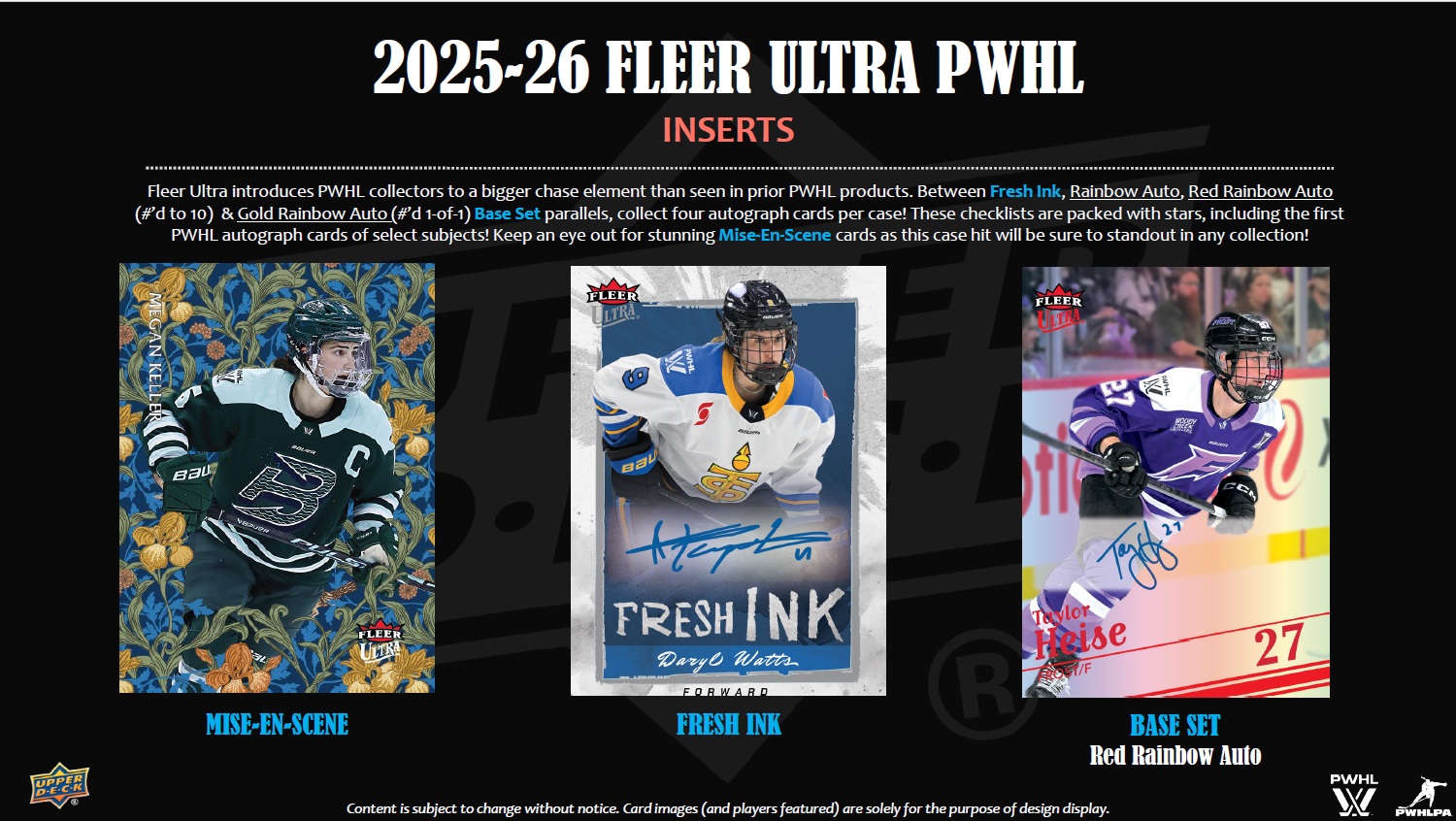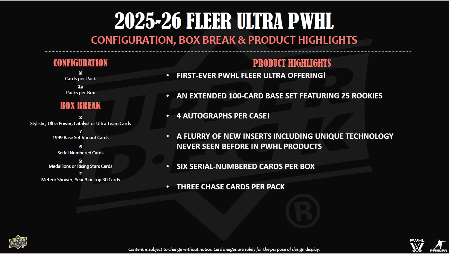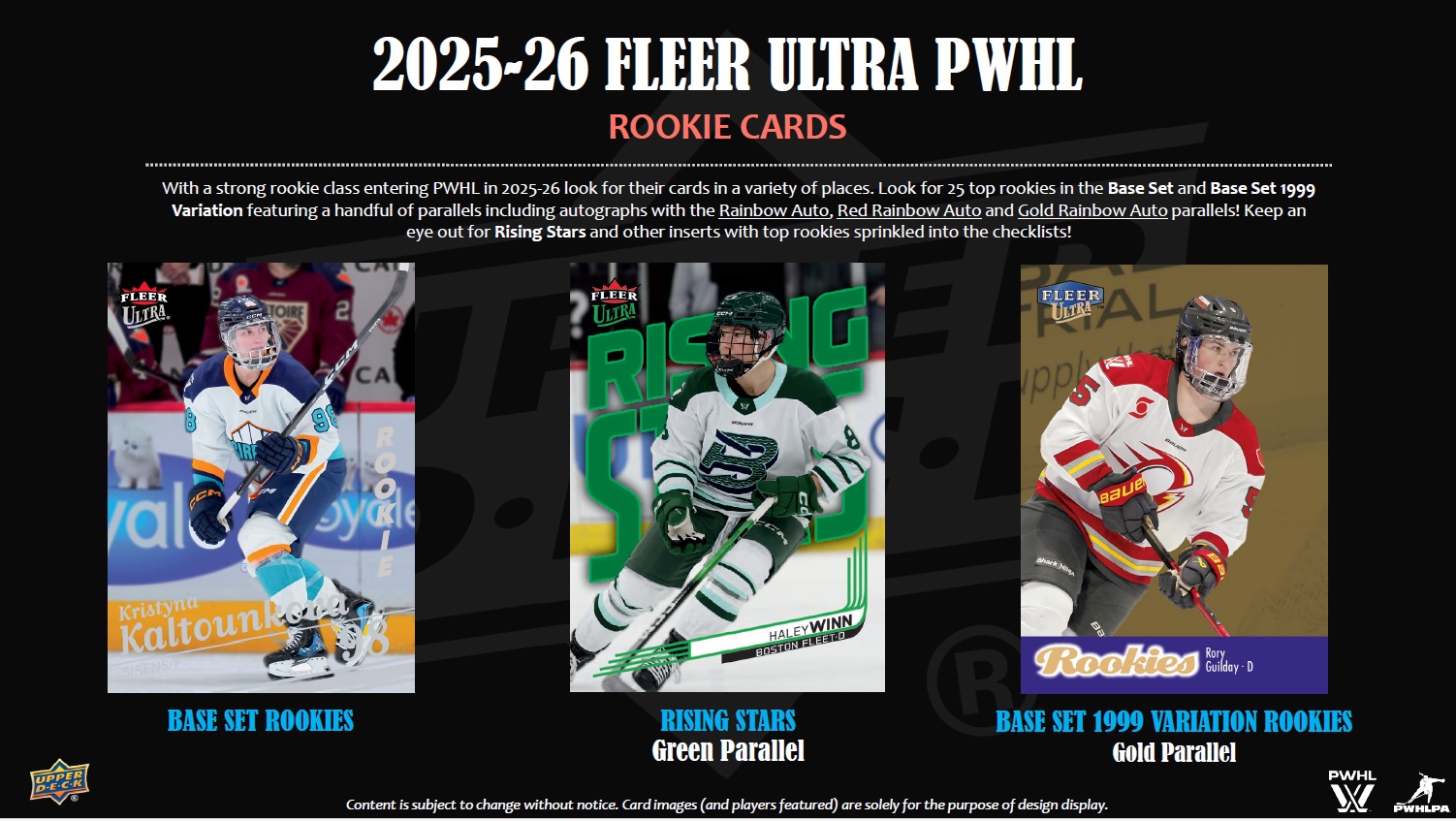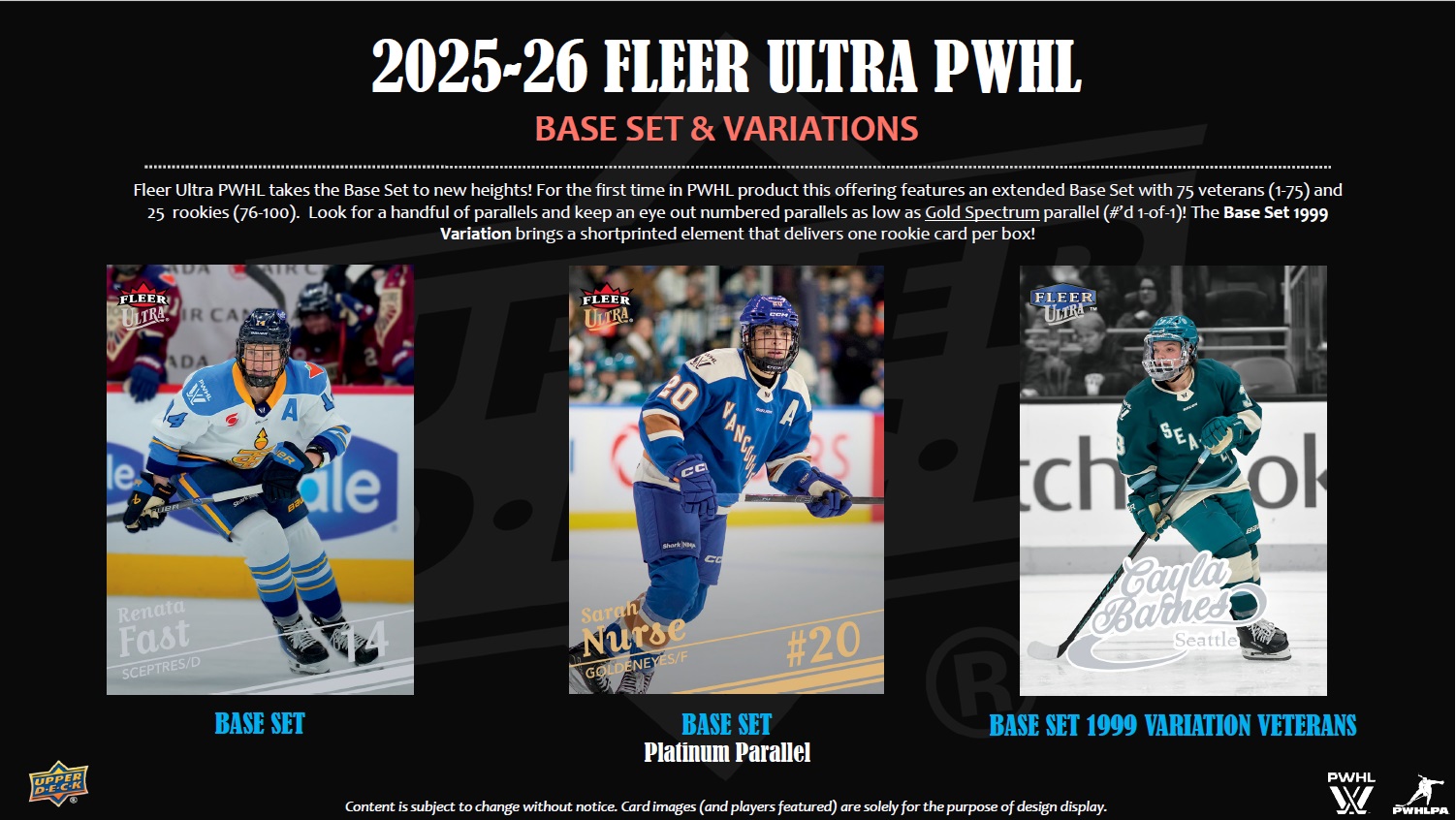 Fleer Ultra PWHL is here! - This set takes the PWHL Base Sets to new heights! For the first time in PWHL product this offering features an extended 100-card Base Set with 75 veterans (1-75) and 25 rookies (76-100).