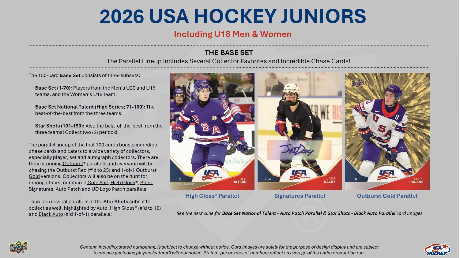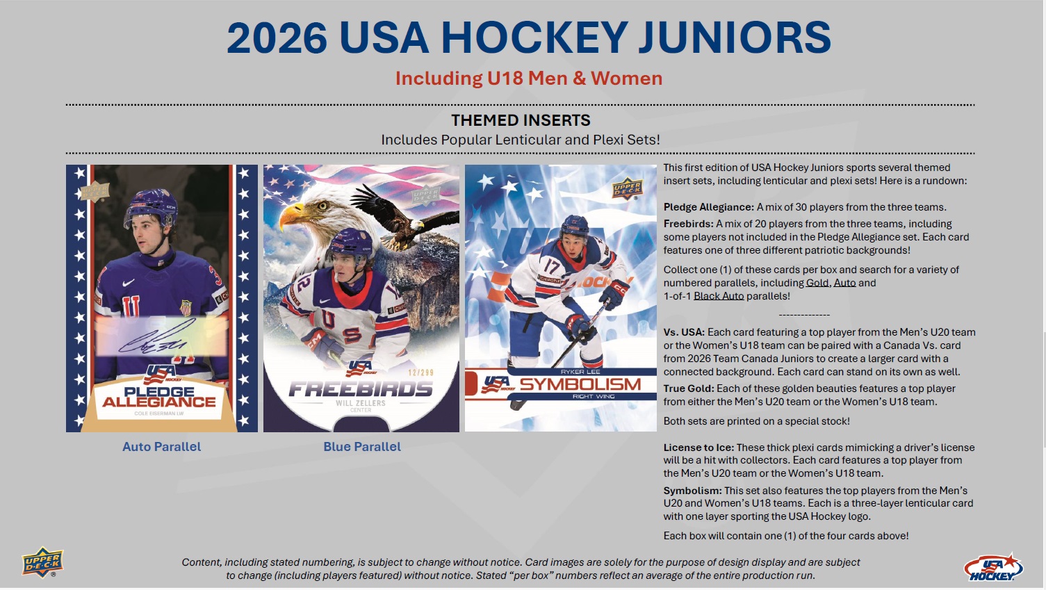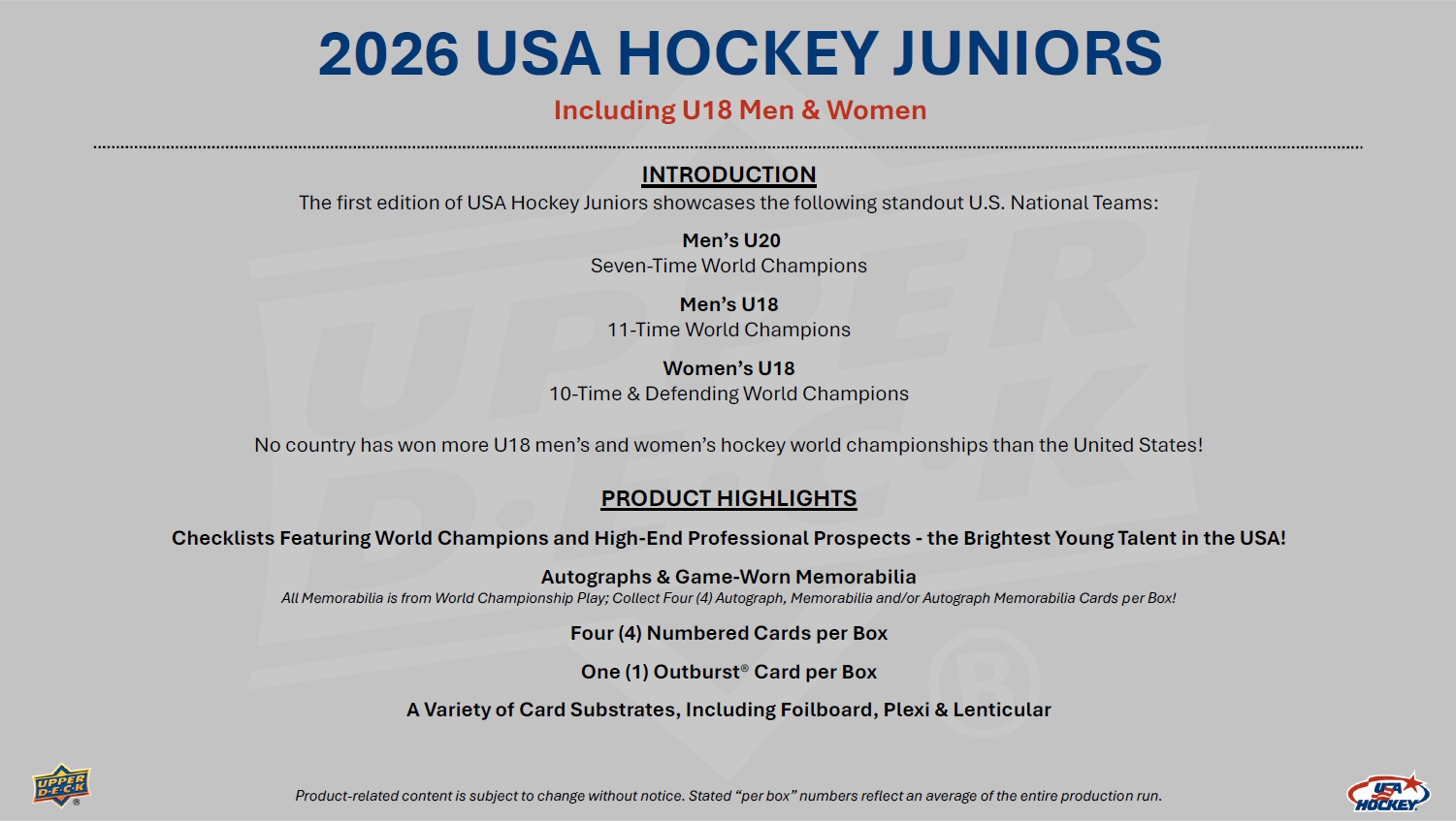 OVERVIEW The inaugural edition of Team USA Juniors showcases the standout American Men’s U20 (seven-time world champions), Men’s U18 (11-time world champions) and Women’s U18 (10-time & defending world champions) National Teams. No country has won more U18 men’s and women’s hockey world championships than the United States! THE BASE SET The 150-card Base Set consists of three subsets: Base Set (1-70): Players from the Men’s U20 and U18 teams, and the Women’s U18 team. Base Set National Talent (High Series; 71-100): The best-of-the-best from the three teams. Star Shots (101-150): Also the best-of-the best from the three teams! Collect, on average, two (2) per box! The parallel lineup of the first 100 cards boasts a number of incredible chase cards and caters to a wide variety of collectors, especially player, set and autograph collectors. There are three stunning Outburst® parallels and everyone will be chasing the 1-of-1 Gold Outburst cards! Collectors will also be on the hunt for, among others, Gold Foil (#’d to 35), High Gloss® (#’d to 10), Black Signatures (#’d to 5), Auto Patch (#’d to 150, 99 and 25) and UD Logo Patch (#’d to 3) parallels. There are several parallels of the Star Shots subset to collect as well, highlighted by Auto, High Gloss® (#’d to 10) and Black Auto (#’d 1-of-1) parallels! THEMED INSERTS This first edition of Team USA Juniors sports several themed insert sets, including lenticular and plexi sets! Here is a rundown: Pledge Allegiance: 30 top players from the three teams. Freebirds: 20 top players from the three teams (including some players not included in the Pledge Allegiance set) on a very patriotic design! • Collect, on average, one (1) of these cards per box. • Search for a variety of numbered parallels, including Gold (#’d to 35), Auto (#’d to 10) and 1-of-1 Black Auto parallels! Vs. USA: Each card featuring a top player from the Men’s U20 team or the Women’s U18 team can be paired with a Canada Vs. card from 2026 Team Canada Juniors to create a larger card with a connected background. Each card can stand on its own as well. True Gold: Each of these golden beauties features a top player from either the Men’s U20 team or the Women’s U18 team. • Both of these cards are printed on a special stock! Licensed to Ice (Plexi Cards!): These thick plexi cards mimicking a driver’s license will be a hit with collectors. Each card features a top player from the Men’s U20 team or the Women’s U18 team. Symbolism (Lenticular Cards!): This set also features the top players from the Men’s U20 and Women’s U18 teams. Each is a three-layer lenticular card with one layer sporting the USA Hockey logo. • Each box will contain, on average, one (1) of the four cards above!