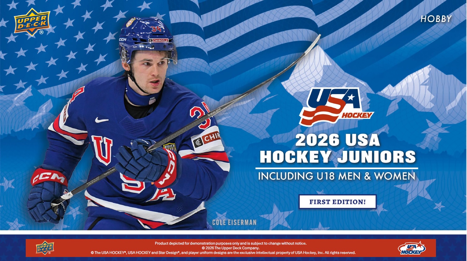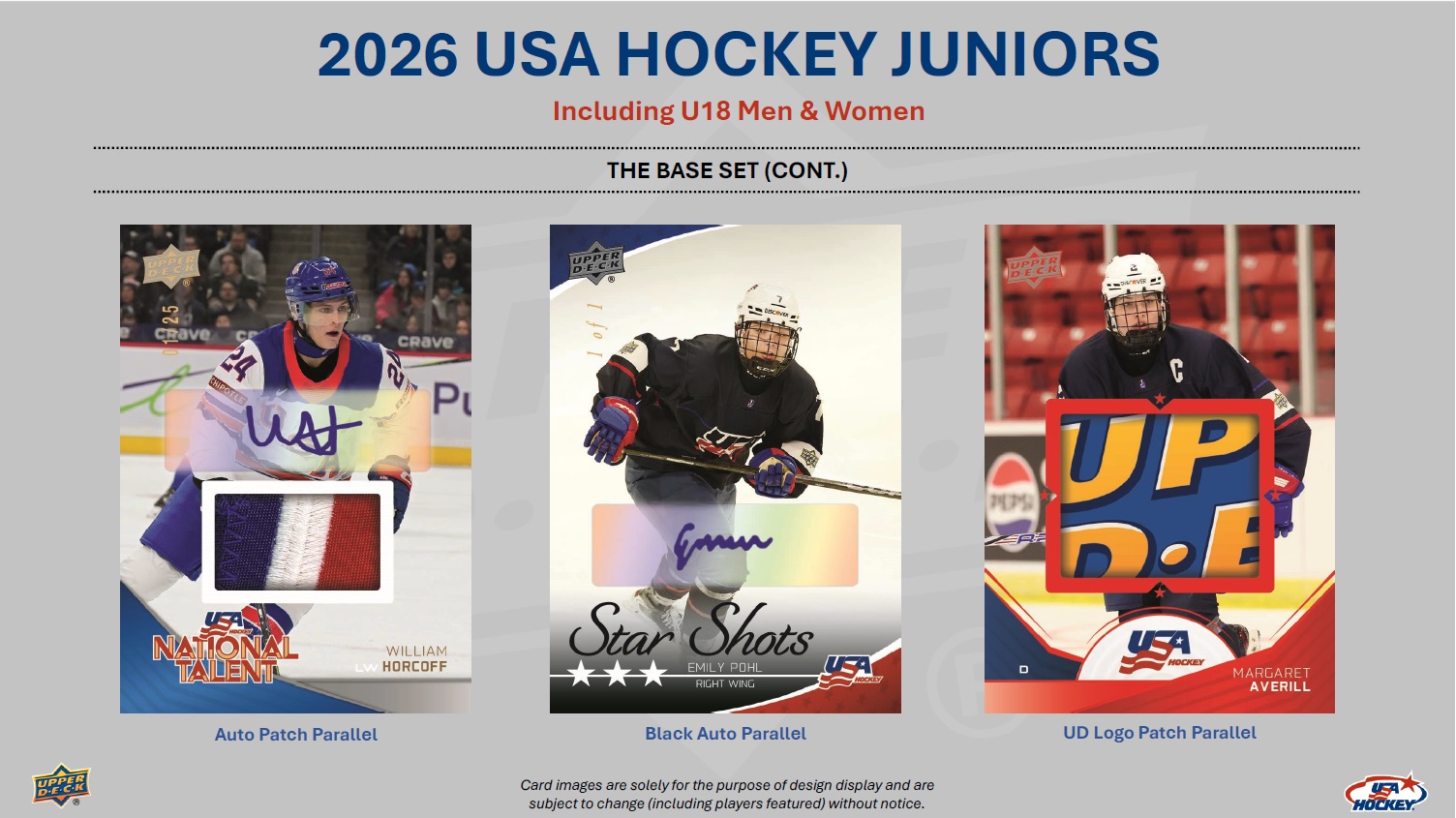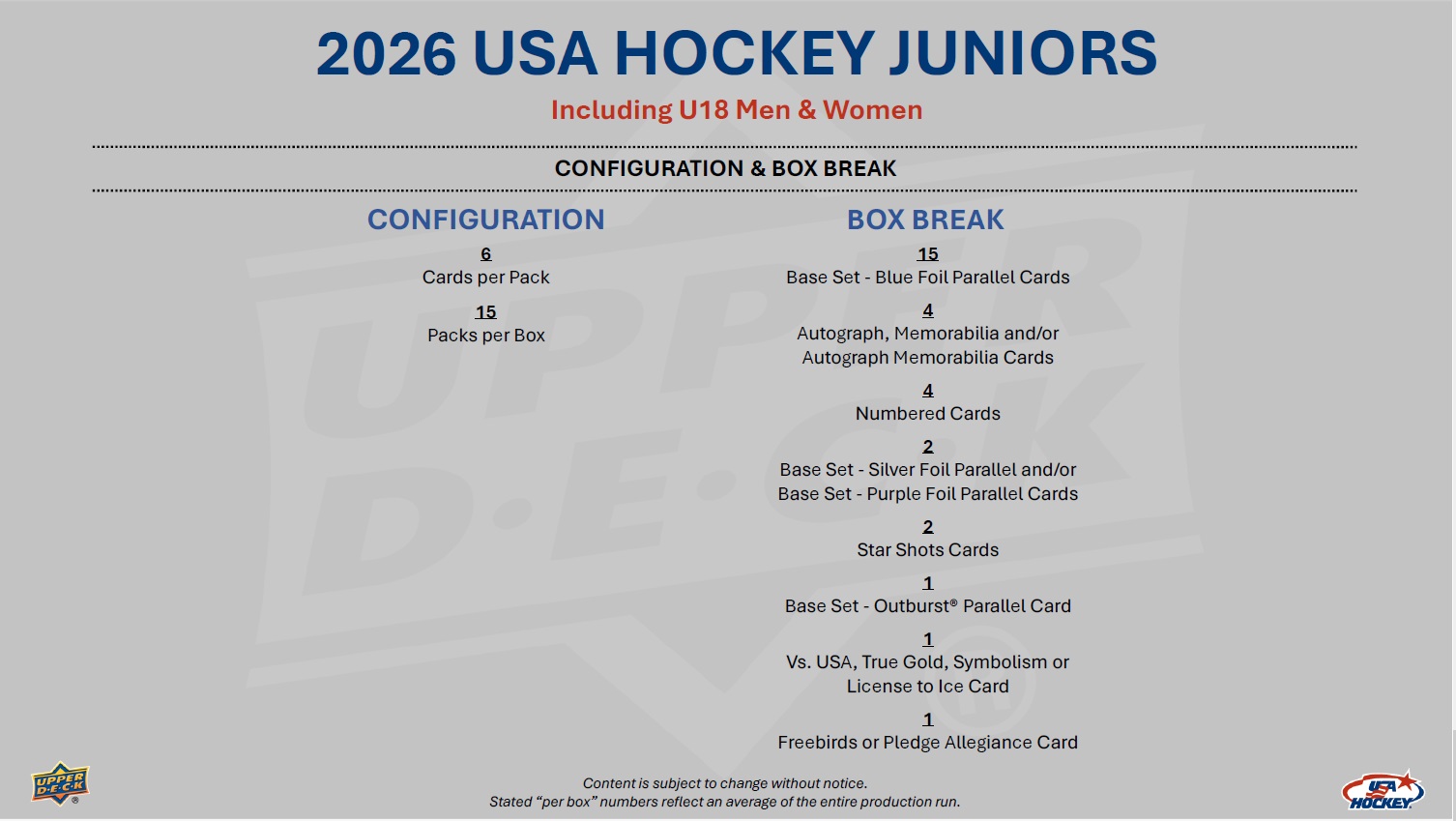 OVERVIEW The inaugural edition of Team USA Juniors showcases the standout American Men’s U20 (seven-time world champions), Men’s U18 (11-time world champions) and Women’s U18 (10-time & defending world champions) National Teams. No country has won more U18 men’s and women’s hockey world championships than the United States! THE BASE SET The 150-card Base Set consists of three subsets: Base Set (1-70): Players from the Men’s U20 and U18 teams, and the Women’s U18 team. Base Set National Talent (High Series; 71-100): The best-of-the-best from the three teams. Star Shots (101-150): Also the best-of-the best from the three teams! Collect, on average, two (2) per box! The parallel lineup of the first 100 cards boasts a number of incredible chase cards and caters to a wide variety of collectors, especially player, set and autograph collectors. There are three stunning Outburst® parallels and everyone will be chasing the 1-of-1 Gold Outburst cards! Collectors will also be on the hunt for, among others, Gold Foil (#’d to 35), High Gloss® (#’d to 10), Black Signatures (#’d to 5), Auto Patch (#’d to 150, 99 and 25) and UD Logo Patch (#’d to 3) parallels. There are several parallels of the Star Shots subset to collect as well, highlighted by Auto, High Gloss® (#’d to 10) and Black Auto (#’d 1-of-1) parallels! THEMED INSERTS This first edition of Team USA Juniors sports several themed insert sets, including lenticular and plexi sets! Here is a rundown: Pledge Allegiance: 30 top players from the three teams. Freebirds: 20 top players from the three teams (including some players not included in the Pledge Allegiance set) on a very patriotic design! • Collect, on average, one (1) of these cards per box. • Search for a variety of numbered parallels, including Gold (#’d to 35), Auto (#’d to 10) and 1-of-1 Black Auto parallels! Vs. USA: Each card featuring a top player from the Men’s U20 team or the Women’s U18 team can be paired with a Canada Vs. card from 2026 Team Canada Juniors to create a larger card with a connected background. Each card can stand on its own as well. True Gold: Each of these golden beauties features a top player from either the Men’s U20 team or the Women’s U18 team. • Both of these cards are printed on a special stock! Licensed to Ice (Plexi Cards!): These thick plexi cards mimicking a driver’s license will be a hit with collectors. Each card features a top player from the Men’s U20 team or the Women’s U18 team. Symbolism (Lenticular Cards!): This set also features the top players from the Men’s U20 and Women’s U18 teams. Each is a three-layer lenticular card with one layer sporting the USA Hockey logo. • Each box will contain, on average, one (1) of the four cards above!