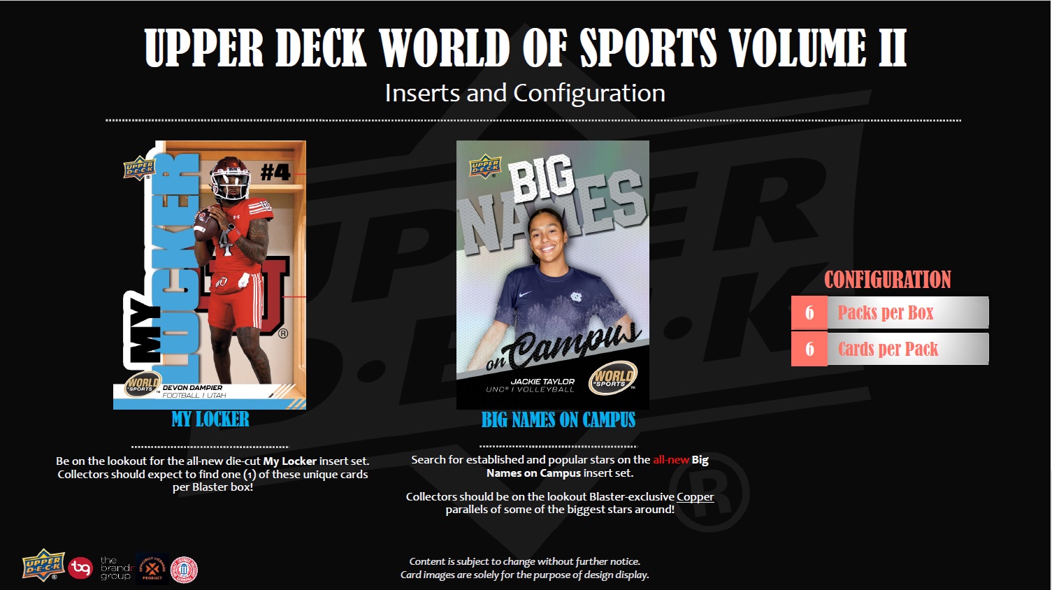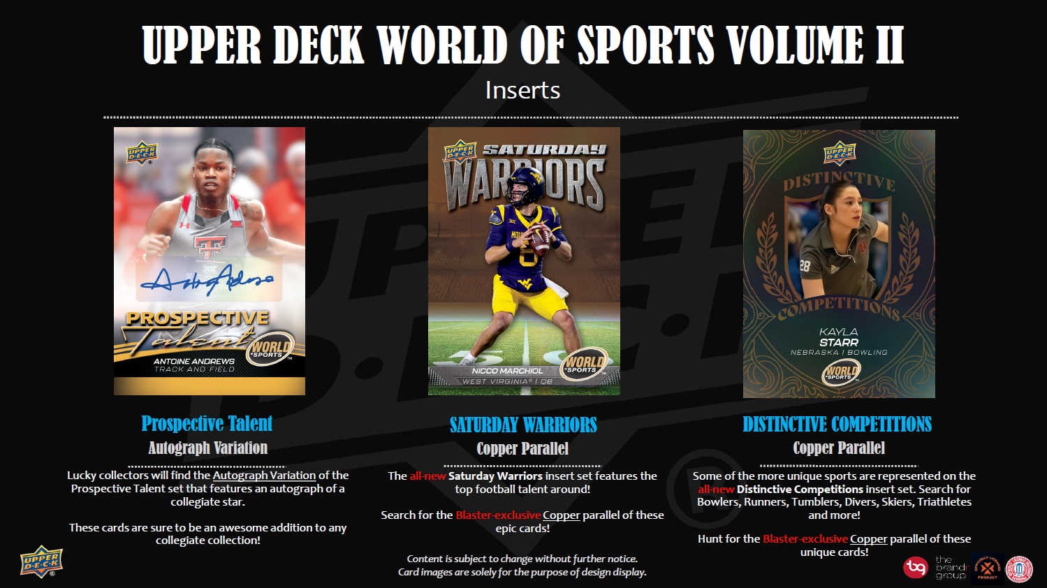 Upper Deck World of Sports returns with a 300-card Base Set loaded with top collegiate athletes! There are over 15 different colleges and universities that are featured and a wide variety of sports. Be on the lookout for a diverse list of top athletes in football, basketball, baseball, softball, tennis, soccer, gymnastics, volleyball, track and field, hockey, and more! • Collect your Prospective Talent stars! This 100-card subset of the Base Set features some of the top collegiate athletes in the world! Collectors can expect to find, onaverage, two (2) of these awesome cards per blaster box. • Lucky collectors will find the Autograph Variation of the Prospective Talent set that features an autograph of a collegiate star. These cards are sure to be an awesome addition to any collegiate collection! • All-new inserts! World of Sports is chock-full of awesome inserts to collect! o The all-new Saturday Warriors insert set features the top football talent around! Search for the Blaster-exclusive Copper parallel of these epic cards! o Some of the more unique sports are represented on the all-new Distinctive Competitions insert set. Search for Bowlers, Runners, Tumblers, Divers, Skiers, Triathletes and more! Hunt for the Blaster-exclusive Copper parallel of these unique cards! o Be on the lookout for the all-new die-cut My Locker insert set. Collectors should expect to find one (1) of these unique cards per Blaster box! o Search for established and popular stars on the all-new Big Names on Campus insert set. Collectors should be on the lookout Blaster-exclusive Copper parallels of some of the biggest stars around!