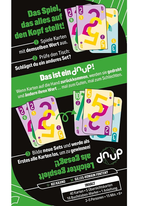 dnup, das Kartenspiel, das alles auf den Kopf stellt! Spiele Karten mit demselben Wert aus, um andere Sets zu schlagen. Wird dein Set geschlagen, nimm die Karten auf die Hand und drehe sie. Dadurch verändern sie ihren Wert… mal zum Guten, mal zum Schlechten. Durch kluges Ausspielen der Karten und das Zurückschicken geschwächter Kombinationen verschaffst du dir einen taktischen Vorteil. Werde als Erstes alle Karten los, um zu gewinnen!