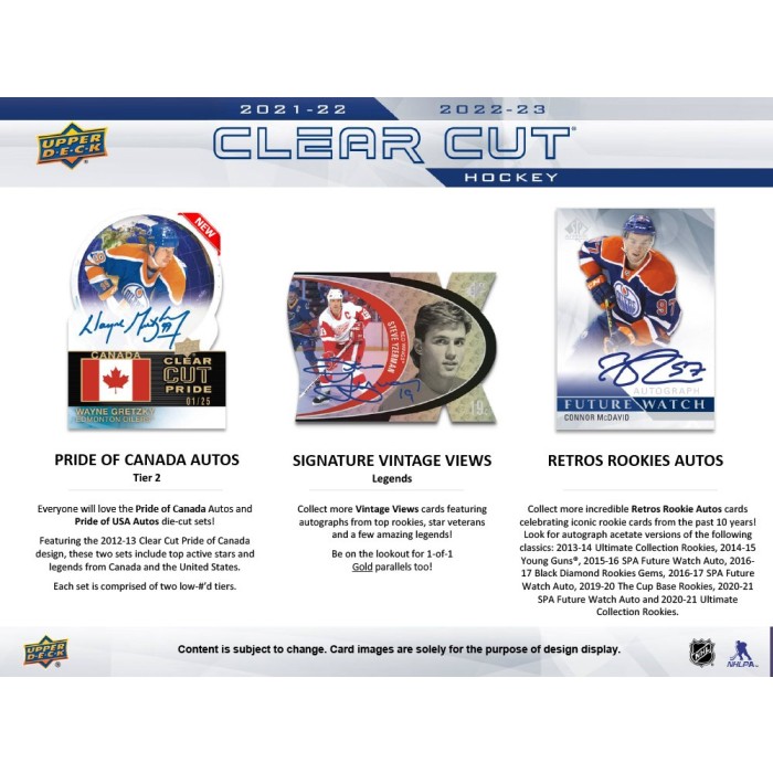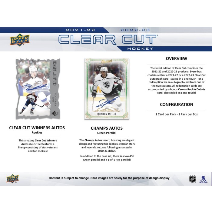 The latest edition of Clear Cut combines the 2021-22 and 2022-23 products. Every box contains either a 2021-22 or a 2022-23 Clear Cut autograph card - sealed in a one-touch - or a redemption for an autograph card from one of the two seasons. All redemption cards are accompanied by a bonus Canvas Rookie Debuts card, also sealed in a one-touch!