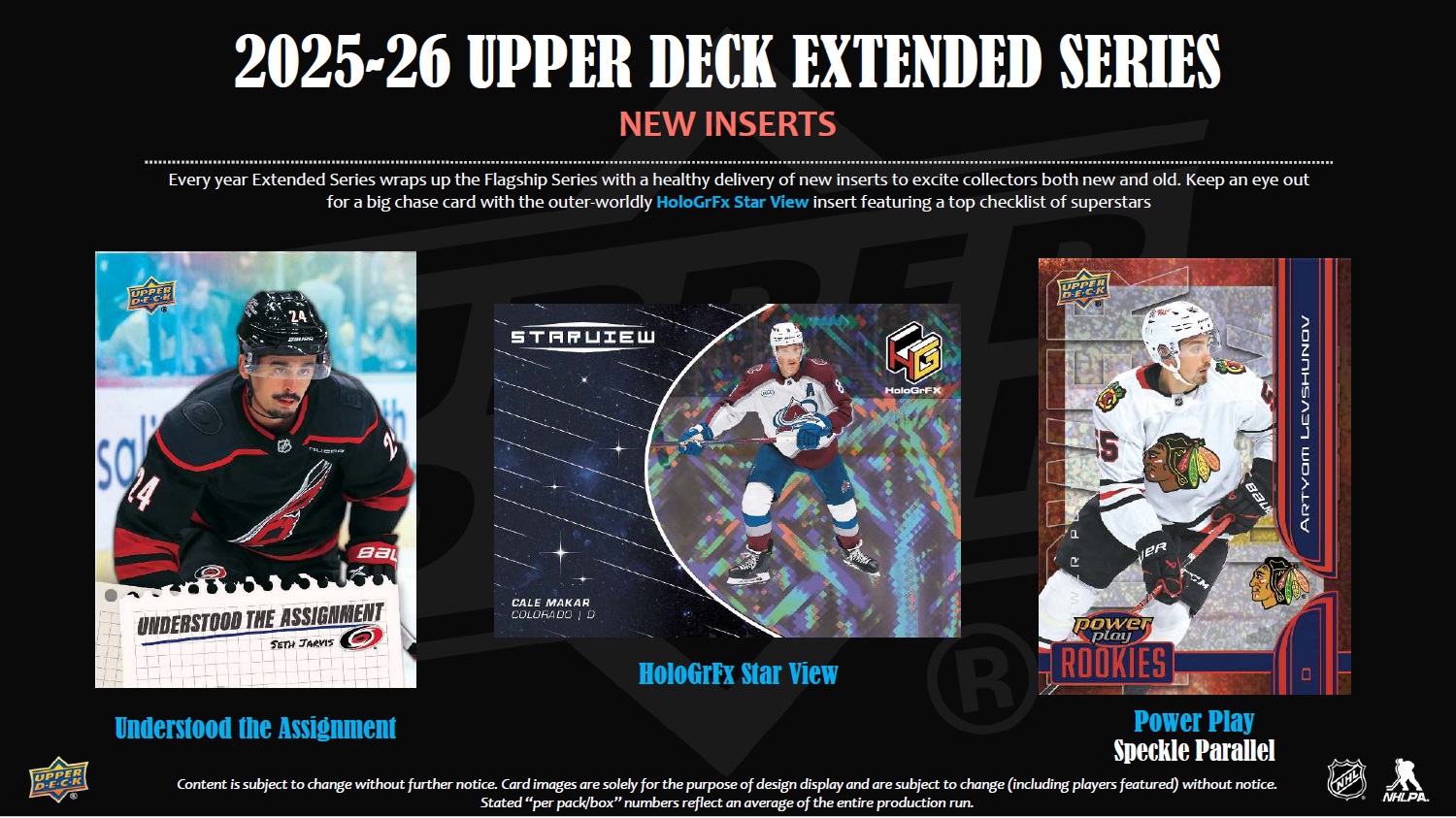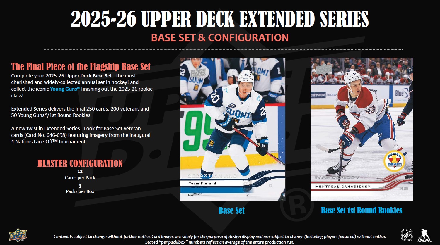 Extended Series delivers the final 250 cards: 200 veterans and 50 Young Guns®/1st Round Rookies (2025-26 rookies that were first round selections). Be on the lookout for the elusive Outburst parallels of these exciting cards: Complete your 2025-26 UD Canvas® set! In addition to the veteran cards, keep an eye out for Young Guns®, Legends and within Extended Series this year, a new subset highlighting the inaugural NHL 4 Nations Face-OffTM.