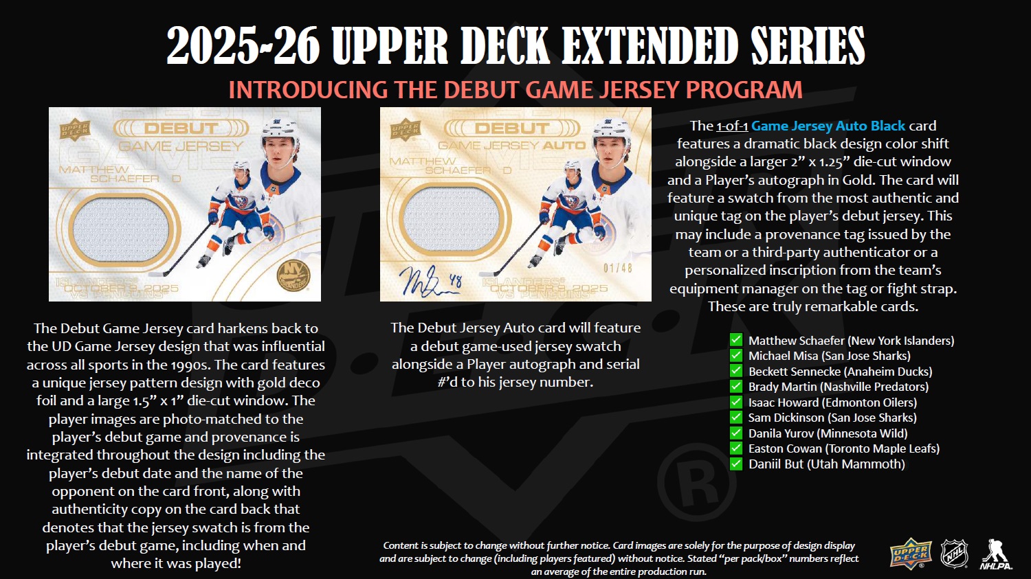 NEW! Paying homage to the famous Upper Deck insert from the 90s, the new UD Debut Game Jersey memorabilia cards have arrived with a brilliant desig with photo-matched memorabilia! This cards introduction marks a historic moment in Hockey Trading Card History as these jersey swatches are guaranteed to be worn during the featured subjects debut in the NHL!