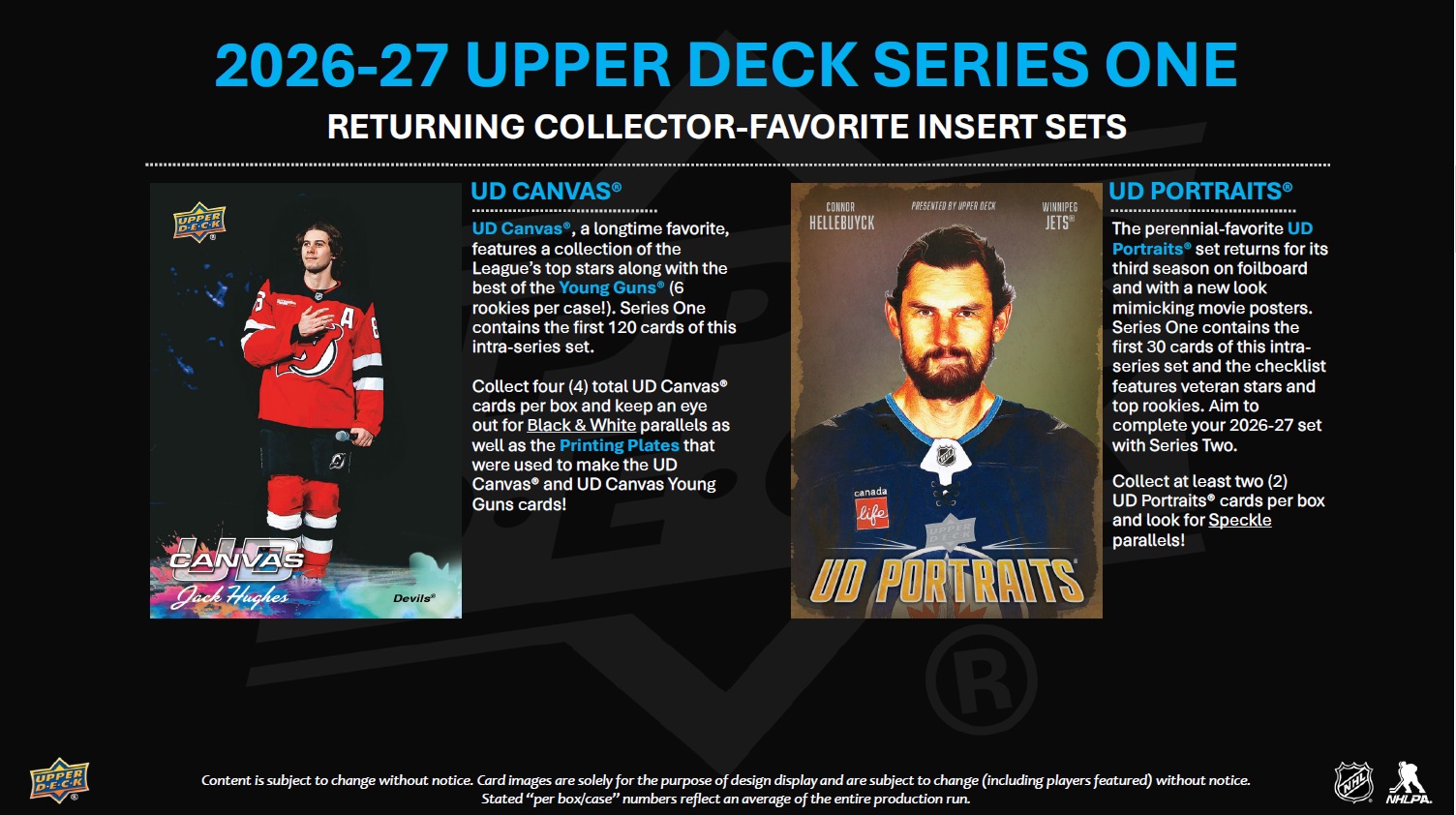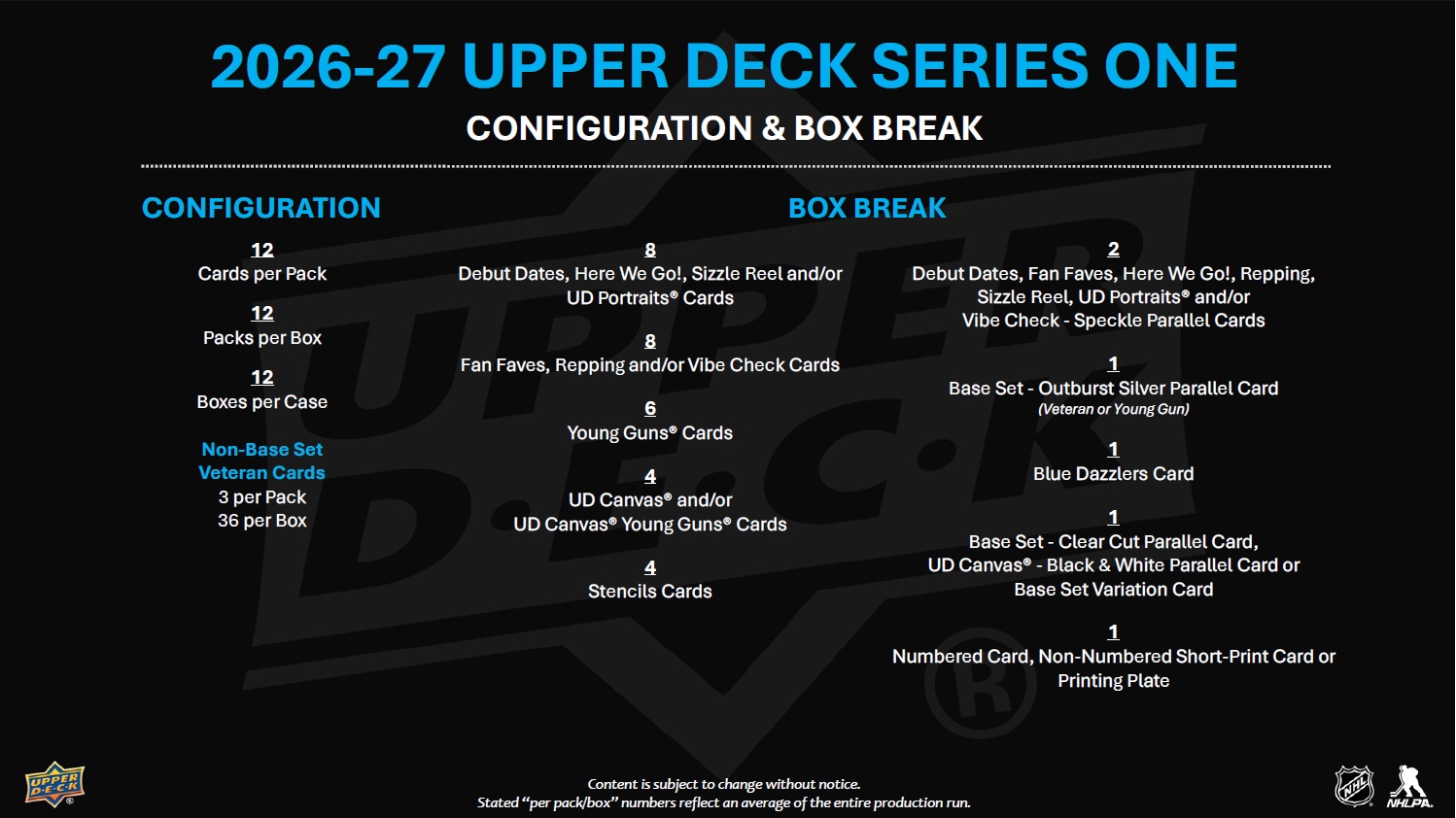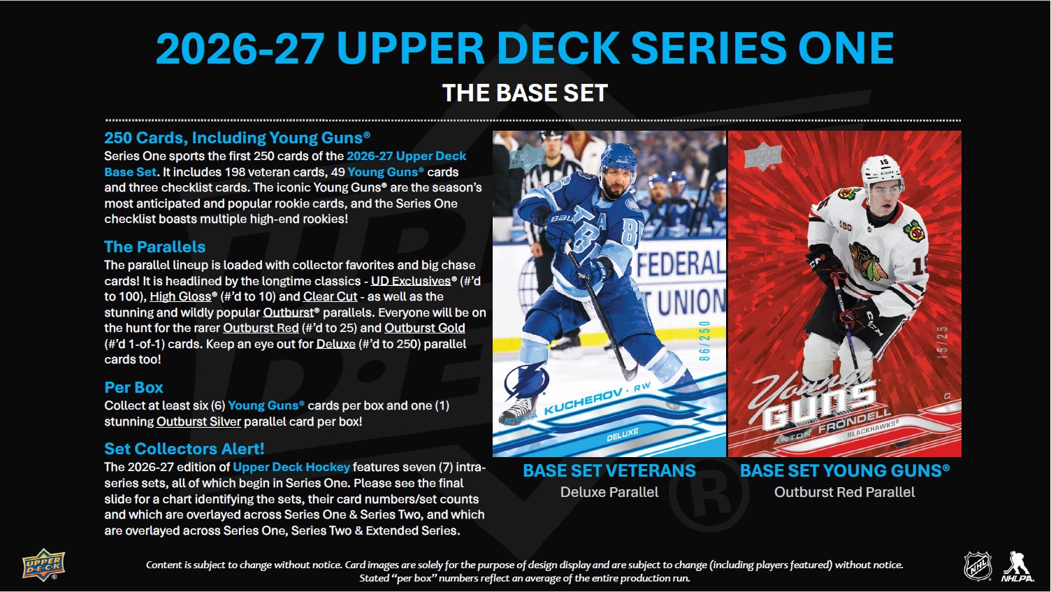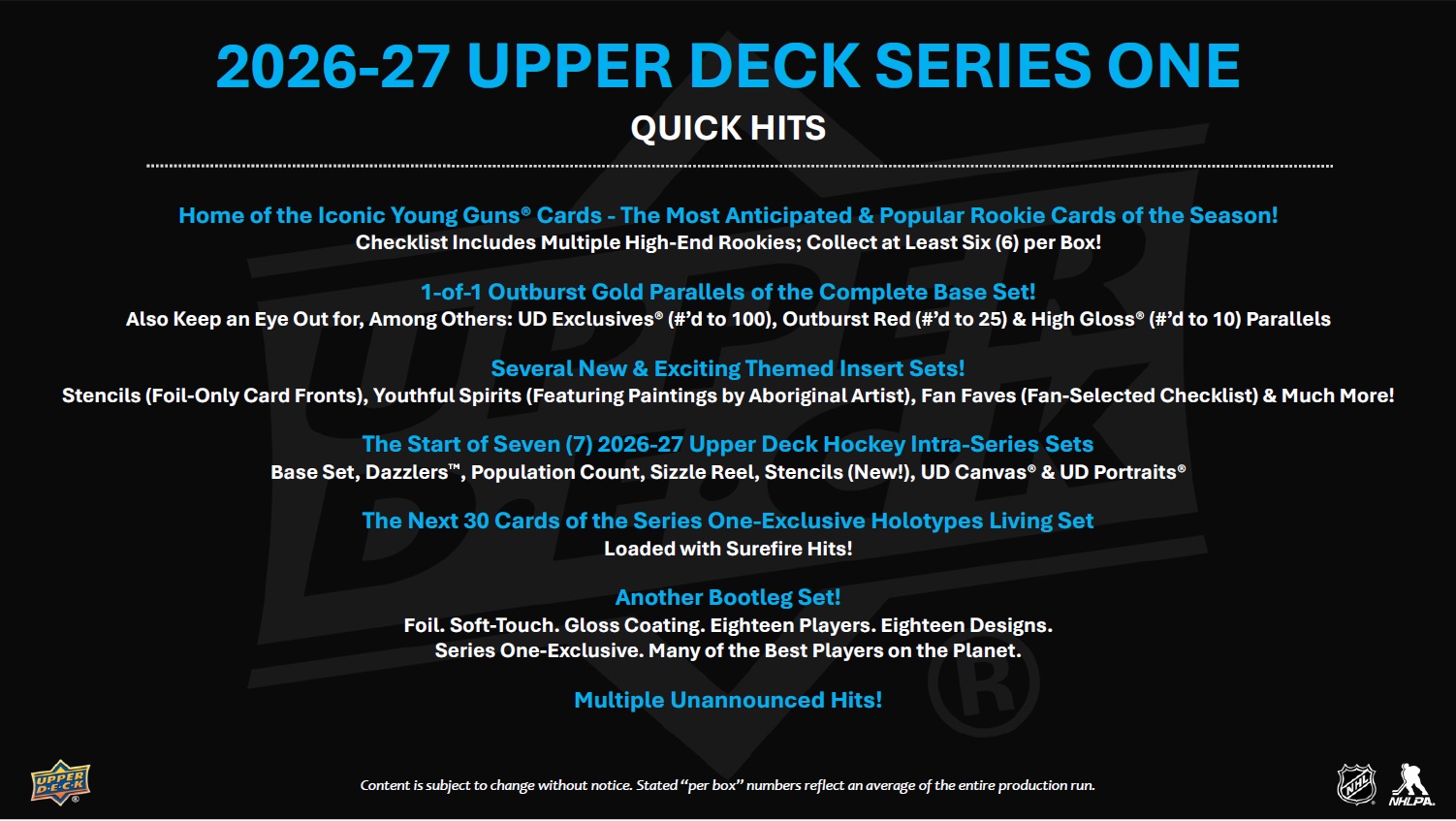 THE MOST WIDELY-COLLECTED BASE SET IN HOCKEY INCLUDES THE MOST ANTICIPATED & POPULAR ROOKIE CARDS OF THE SEASON! Series One sports the first 250 cards of the 2026-27 Upper Deck Base Set. It includes 198 veteran cards, 49 Young Guns® cards and three checklist cards. The iconic Young Guns® are the season’s most anticipated and popular rookie cards, and the Series One checklist boasts multiple high-end rookies! • Collect six (6) Young Guns® cards per box, on average! The parallel lineup is loaded with collector favorites and big chase cards! It is headlined by the longtime classics - UD Exclusives® (#’d to 100), High Gloss® (#’d to 10) and Clear Cut - as well as the stunning and wildly popular Outburst® parallels. Each box will contain, on average, one (1) Outburst Silver parallel card, and everyone will be on the hunt for the rarer Outburst Red (#’d to 25) and Outburst Gold (#’d 1-of-1) cards. There are Deluxe (#’d to 250) parallels too! As longtime Upper Deck Hockey collectors know, there are always some outstanding Base Set Variation sets to collect, highlighted by the long- running and popular Snow Spray Auto variation. That’s not the only one though. On top of that, this latest edition of Series One boasts three new variation sets. We’ll just leave it at that! RETURNING COLLECTOR-FAVORITE INSERT SETS UD Canvas®, a longtime favorite, features a collection of the League’s top stars along with the best of the Young Guns® (6 rookies per case, on average). Series One contains the first 120 cards of this intra-series set. Collect four (4) UD Canvas® cards per box, on average, and keep an eye out for Black & White parallels as well as the Printing Plates that were used to make the UD Canvas® and UD Canvas Young Guns cards! The Population Count acetate insert is back and with a new look! There are seven different print runs (1000, 500, 100, 50, 25, 10 and 1) of this popular intra-series set mimicking slabbed cards and featuring top-tier stars and rookies. Everyone will be chasing these cards, especially the lower-print run versions! The final 30 cards of this set will be available in Series Two. The Dazzlers™ set also returns for another season. These eye-popping cards boast a new design for the 2026-27 season and come in Blue, Pink and Gold versions! This is a 150-card intra-series set, and Series One sports the first 50 cards. The checklist consists of mostly star veterans, but there are a couple rookies sprinkled in! Look for a larger number of rookies in Series Two and Extended Series. Collect, on average, one (1) Blue version per box and one (1) Pink version per case, and if you’re lucky, you’ll pull a much, much rarer Gold version! The perennial-favorite UD Portraits® set returns for its third season on foilboard and with a new look mimicking movie posters. Series One contains the first 30 cards of this intra-series set and the checklist features veteran stars and top rookies. Aim to complete your 2026-27 UD Portraits® set with Series Two. Keep an eye out for Speckle parallels! The Sizzle Reel foilboard set commemorating top highlight reel plays from the 2025-26 season is back! On the back of each card featuring a star player is a QR code that leads you to the video of the highlight reel play. Collect the first 35 cards of this intra-series set and look for Speckle parallels! RETURNING & SERIES ONE-EXCLUSIVE INSERT SETS Collect the next 30 cards (HT-61 - HT-90) of the star-studded Holotypes living set. These hologram cards are only available once a season and fall just once in every 3.5 cases, on average. This set is loaded with surefire hits! Foil. Soft-touch. Gloss coating. Eighteen players. Eighteen designs. After a triumphant debut in 2025-26, the Bootleg set is back! The checklist sees the return of the best players on the planet, and there are some new superstars (and some superstars in the making!) in the mix this season. Every card from this Series One-exclusive set will be coveted and a great addition to any collection! NEW INSERT SETS! As always, Series One features a bevy of exciting new themed insert sets. Here is a look at just some of the sets: Debut Dates: This set commemorates the debut of 20 top rookies. Each card sports the date of each player’s first game in the League, as well as the opponent. Each card also boasts a photo from that first game. Here We Go!: This photo-driven set captures star players - who may also be rivals - squaring off in the face-off circle. • Both sets - which will only be available in Series One - are printed on foilboard. Each box contains, on average, at least one (1) card from each set. There are also Speckle parallels to collect! Electric Soul: Everyone is going to love these artistic cards! They are gorgeous. Each features a one-color player image on a team-color background. Oh, and each player will be one of the best in the world! Youthful Spirits: This set features 12 superstars (again, the best in the world!) and the backdrop for each is one of 12 original paintings by Presten Warren, an award-winning Aboriginal artist and storyteller! Each painting was created solely for this set and features the players’ team colors. This unique and thrilling collaboration has produced a must-have set! • The cards from these two sets boast the same rarity and build as the Bootleg cards! Stencils: This new stylish set with a deep, colorful parallel lineup is unlike any set you’ve seen before! There is no ink on the front of these cards! Each card front just features a stencil-generated shoulder-up player image, the player’s last name and the Upper Deck logo - all presented in foil only! The first 100 cards of this intra-series set will feature veteran stars and top rookies, and there are at least two players from every team. • Collect four (4) of these cards per box, on average, and search for Red (#’d to 399), Yellow (#’d to 199), Green (#’d to 99), Blue (#’d to 50) and Purple (#’d to 25) p