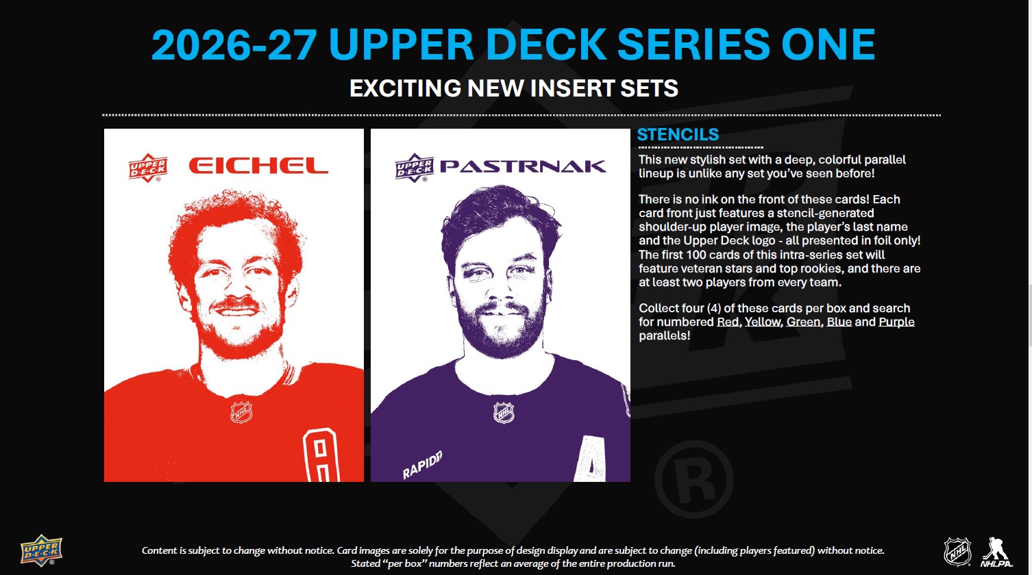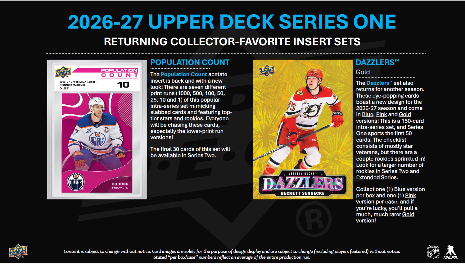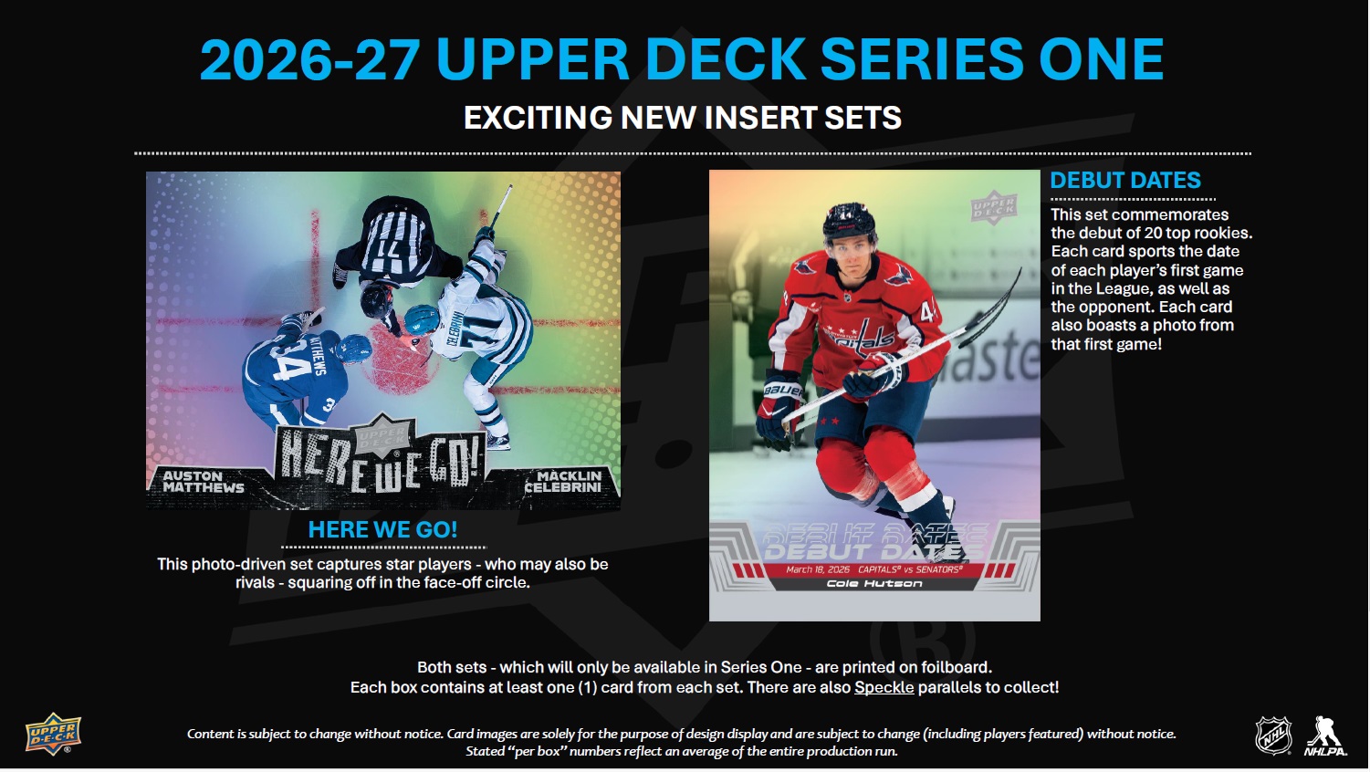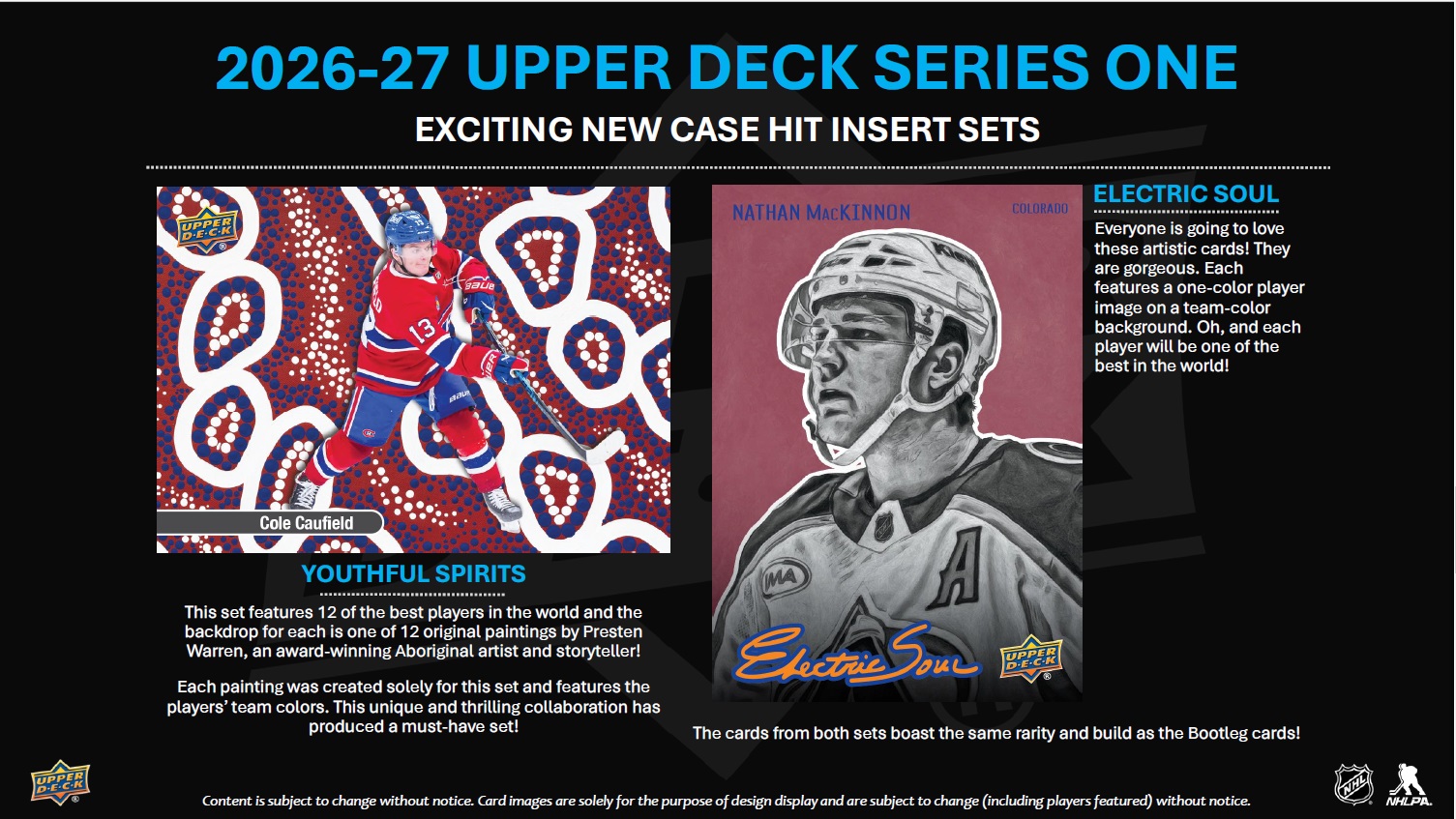 THE MOST WIDELY-COLLECTED BASE SET IN HOCKEY INCLUDES THE MOST ANTICIPATED & POPULAR ROOKIE CARDS OF THE SEASON! Series One sports the first 250 cards of the 2026-27 Upper Deck Base Set. It includes 198 veteran cards, 49 Young Guns® cards and three checklist cards. The iconic Young Guns® are the season’s most anticipated and popular rookie cards, and the Series One checklist boasts multiple high-end rookies! • Collect six (6) Young Guns® cards per box, on average! The parallel lineup is loaded with collector favorites and big chase cards! It is headlined by the longtime classics - UD Exclusives® (#’d to 100), High Gloss® (#’d to 10) and Clear Cut - as well as the stunning and wildly popular Outburst® parallels. Each box will contain, on average, one (1) Outburst Silver parallel card, and everyone will be on the hunt for the rarer Outburst Red (#’d to 25) and Outburst Gold (#’d 1-of-1) cards. There are Deluxe (#’d to 250) parallels too! As longtime Upper Deck Hockey collectors know, there are always some outstanding Base Set Variation sets to collect, highlighted by the long- running and popular Snow Spray Auto variation. That’s not the only one though. On top of that, this latest edition of Series One boasts three new variation sets. We’ll just leave it at that! RETURNING COLLECTOR-FAVORITE INSERT SETS UD Canvas®, a longtime favorite, features a collection of the League’s top stars along with the best of the Young Guns® (6 rookies per case, on average). Series One contains the first 120 cards of this intra-series set. Collect four (4) UD Canvas® cards per box, on average, and keep an eye out for Black & White parallels as well as the Printing Plates that were used to make the UD Canvas® and UD Canvas Young Guns cards! The Population Count acetate insert is back and with a new look! There are seven different print runs (1000, 500, 100, 50, 25, 10 and 1) of this popular intra-series set mimicking slabbed cards and featuring top-tier stars and rookies. Everyone will be chasing these cards, especially the lower-print run versions! The final 30 cards of this set will be available in Series Two. The Dazzlers™ set also returns for another season. These eye-popping cards boast a new design for the 2026-27 season and come in Blue, Pink and Gold versions! This is a 150-card intra-series set, and Series One sports the first 50 cards. The checklist consists of mostly star veterans, but there are a couple rookies sprinkled in! Look for a larger number of rookies in Series Two and Extended Series. Collect, on average, one (1) Blue version per box and one (1) Pink version per case, and if you’re lucky, you’ll pull a much, much rarer Gold version! The perennial-favorite UD Portraits® set returns for its third season on foilboard and with a new look mimicking movie posters. Series One contains the first 30 cards of this intra-series set and the checklist features veteran stars and top rookies. Aim to complete your 2026-27 UD Portraits® set with Series Two. Keep an eye out for Speckle parallels! The Sizzle Reel foilboard set commemorating top highlight reel plays from the 2025-26 season is back! On the back of each card featuring a star player is a QR code that leads you to the video of the highlight reel play. Collect the first 35 cards of this intra-series set and look for Speckle parallels! RETURNING & SERIES ONE-EXCLUSIVE INSERT SETS Collect the next 30 cards (HT-61 - HT-90) of the star-studded Holotypes living set. These hologram cards are only available once a season and fall just once in every 3.5 cases, on average. This set is loaded with surefire hits! Foil. Soft-touch. Gloss coating. Eighteen players. Eighteen designs. After a triumphant debut in 2025-26, the Bootleg set is back! The checklist sees the return of the best players on the planet, and there are some new superstars (and some superstars in the making!) in the mix this season. Every card from this Series One-exclusive set will be coveted and a great addition to any collection! NEW INSERT SETS! As always, Series One features a bevy of exciting new themed insert sets. Here is a look at just some of the sets: Debut Dates: This set commemorates the debut of 20 top rookies. Each card sports the date of each player’s first game in the League, as well as the opponent. Each card also boasts a photo from that first game. Here We Go!: This photo-driven set captures star players - who may also be rivals - squaring off in the face-off circle. • Both sets - which will only be available in Series One - are printed on foilboard. Each box contains, on average, at least one (1) card from each set. There are also Speckle parallels to collect! Electric Soul: Everyone is going to love these artistic cards! They are gorgeous. Each features a one-color player image on a team-color background. Oh, and each player will be one of the best in the world! Youthful Spirits: This set features 12 superstars (again, the best in the world!) and the backdrop for each is one of 12 original paintings by Presten Warren, an award-winning Aboriginal artist and storyteller! Each painting was created solely for this set and features the players’ team colors. This unique and thrilling collaboration has produced a must-have set! • The cards from these two sets boast the same rarity and build as the Bootleg cards! Stencils: This new stylish set with a deep, colorful parallel lineup is unlike any set you’ve seen before! There is no ink on the front of these cards! Each card front just features a stencil-generated shoulder-up player image, the player’s last name and the Upper Deck logo - all presented in foil only! The first 100 cards of this intra-series set will feature veteran stars and top rookies, and there are at least two players from every team. • Collect four (4) of these cards per box, on average, and search for Red (#’d to 399), Yellow (#’d to 199), Green (#’d to 99), Blue (#’d to 50) and Purple (#’d to 25) p