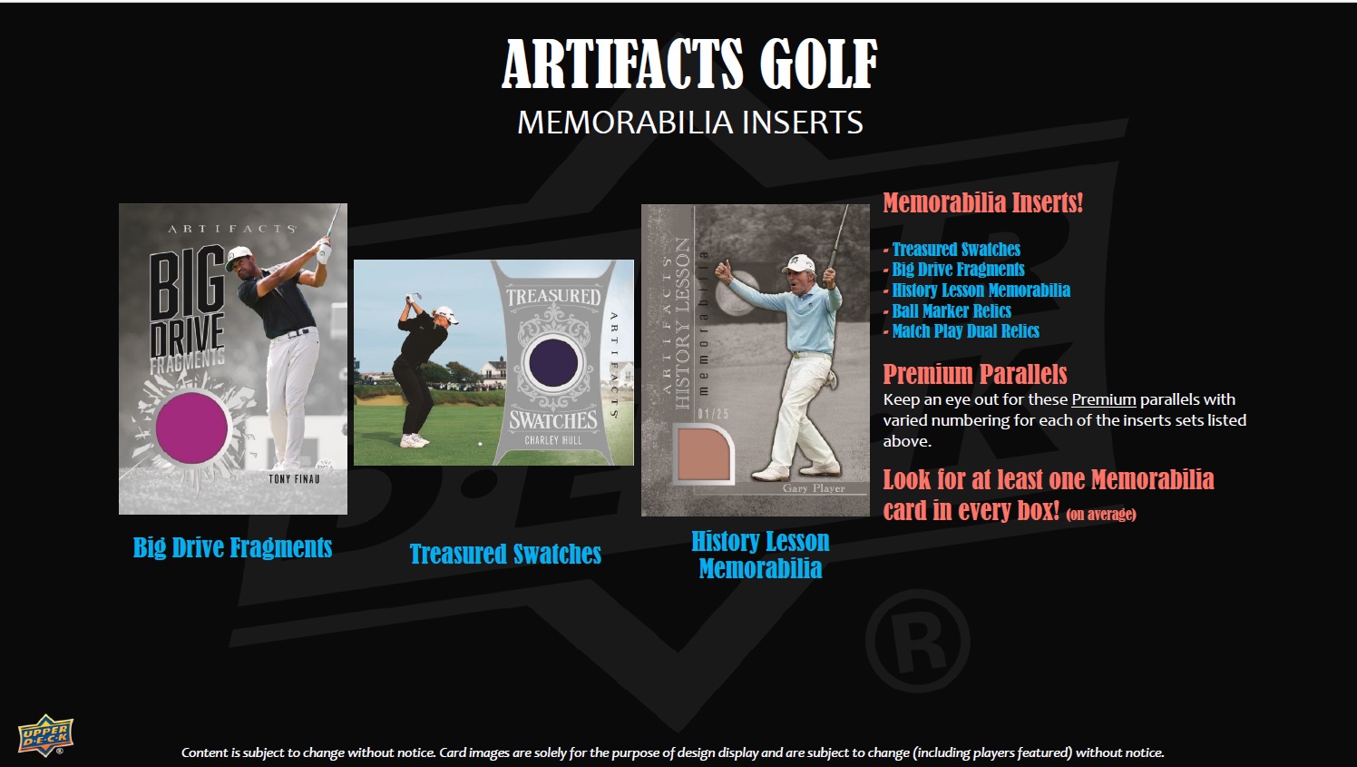Look for Autofacts, Signs of Success, and Opportunists Signatures inserts featuring autographs of the top legends and stars of the game! When you’re gripping and ripping packs, keep an eye out for History Lesson Memorabilia, Big Drive Fragments, Match Play Dual Relics, and Treasured Swatches cards featuring premium swatches from player-worn items.