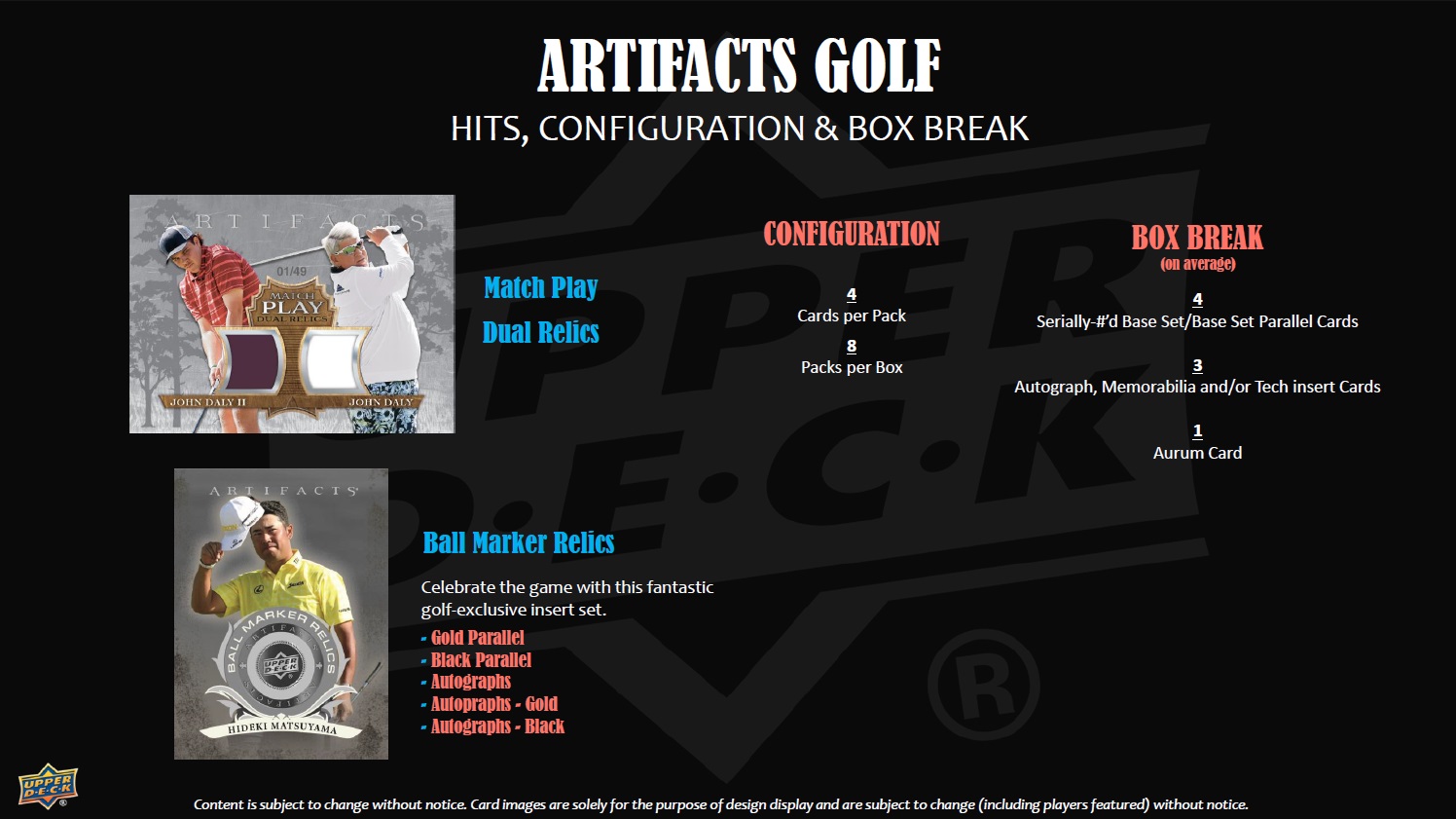 The popular Aurum insert features a 35-card set-within-a-set with each golfer etched out in Gold foil (includes 10 short-print chase subjects). Also, look for rare Aurum Signatures and Aurum Signatures Duals chase cards. The Artifacts Rookie Autographs insert set also includes rare autograph memorabilia versions of golf’s rising stars! Look for Gold parallels numbered to 25 and ultra-rare Black 1-of-1 parallels!