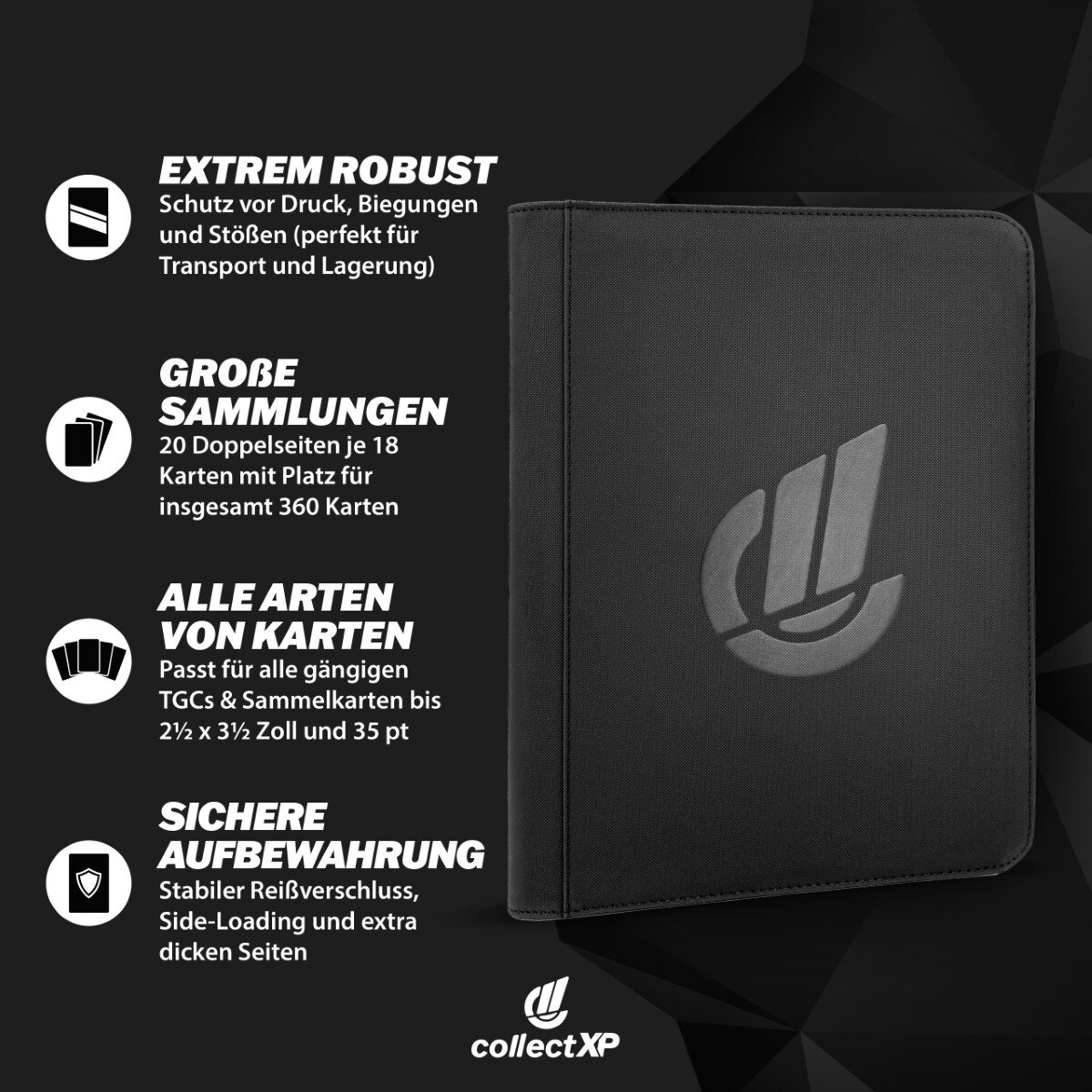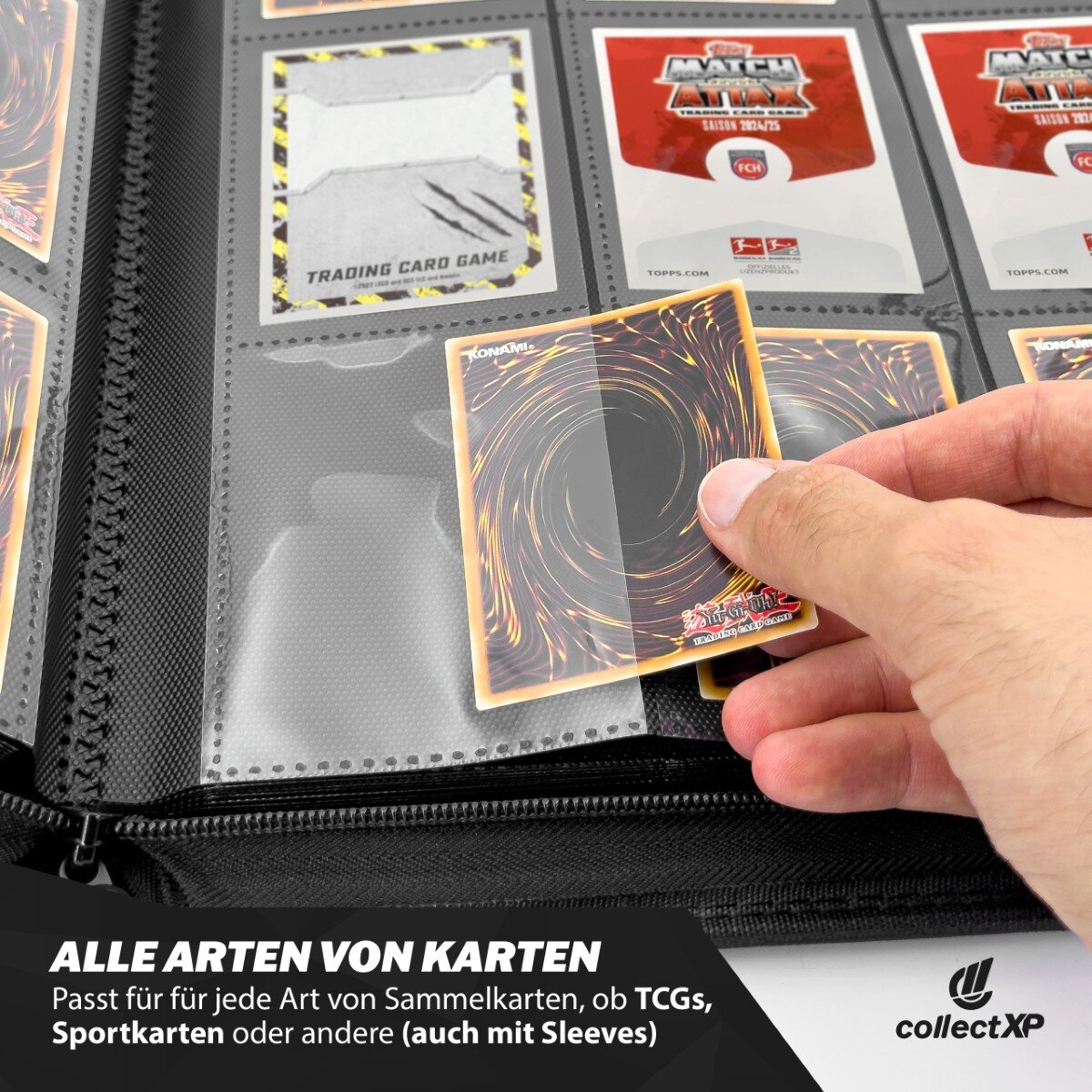 Bewahre deine wertvollsten Karten in diesem praktischen und hochwertigen Sammelkarten Album auf und präsentiere deine Sammlung in bester Ordnung, Sicherheit und Mobilität!
