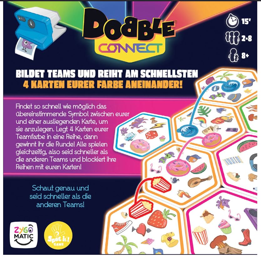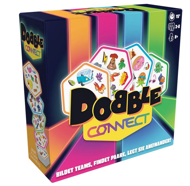 Das beliebte Dobble-Spielprinzip in einem rasanten Teamspiel. In Dobble Connect müssen Teams versuchen vier Karten in ihrer Farbe zu sammeln und aneinanderzureihen. Die Teams versuchen so schnell wie möglich das übereinstimmende Symbol zwischen ihrer Karte und einer ausliegenden Karte zu finden, um sie anzulegen. Liegen vier Karten in der Farbe eines Teams in einer Reihe, hat dieses Team gewonnen. In Dobble Connect spielen alle gleichzeitig. Nur das Team, das schneller ist als die anderen Teams und deren Reihen mit seinen Karten blockiert, hat Chancen auf den Sieg.