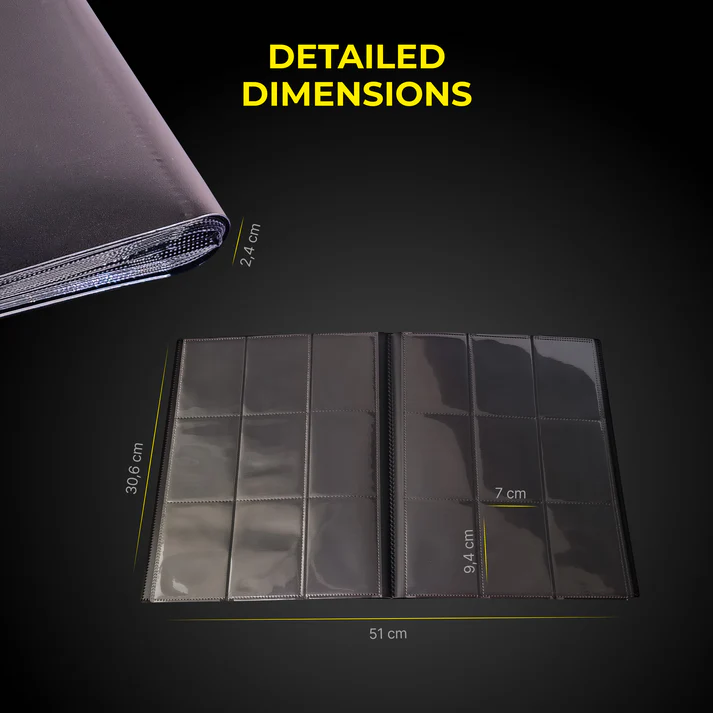 Technische Daten Layout: 3×3 (9 Karten pro Seite) Seiten: 40 doppelseitig Abmessungen: 30,6 × 24,4 × 2,4 cm (geschlossen), 51 cm breit (offen) Taschenformat: 9,4 × 7 cm Kapazität: 360 Karten Material: Robuster Kunststoff, säure- und PVC-frei Verschluss: Gummiband