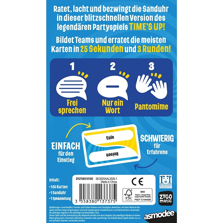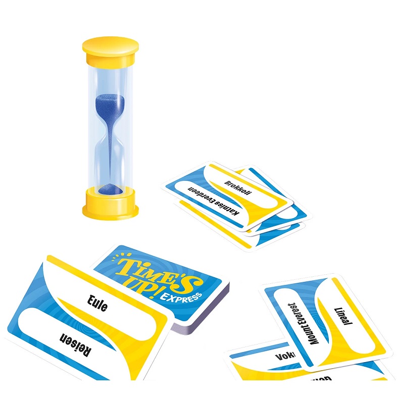 Time’s Up! Express ist ein Partyspiel, das in Teams gespielt wird. In 3 verschiedenen Runden müsst ihr Begriffe erklären, entweder mit Worten oder Pantomimen. Das Team, das nach 3 Runden die meisten Punkte hat, gewinnt die Partie – und allen Ruhm! Für noch mehr Spaß befinden sich auf jeder Karte Worte in 2 Schwierigkeitsgraden.